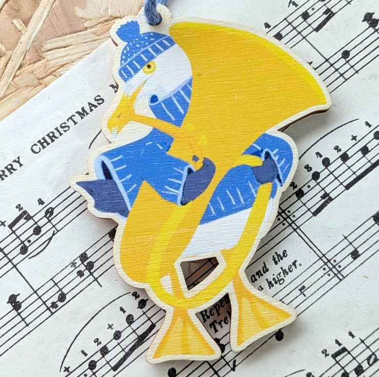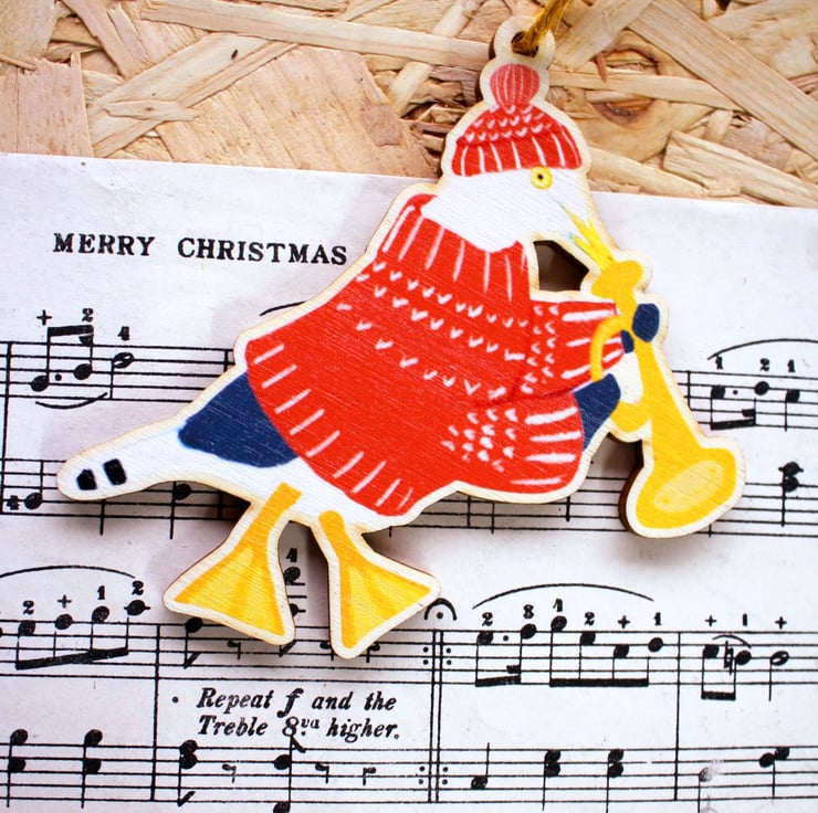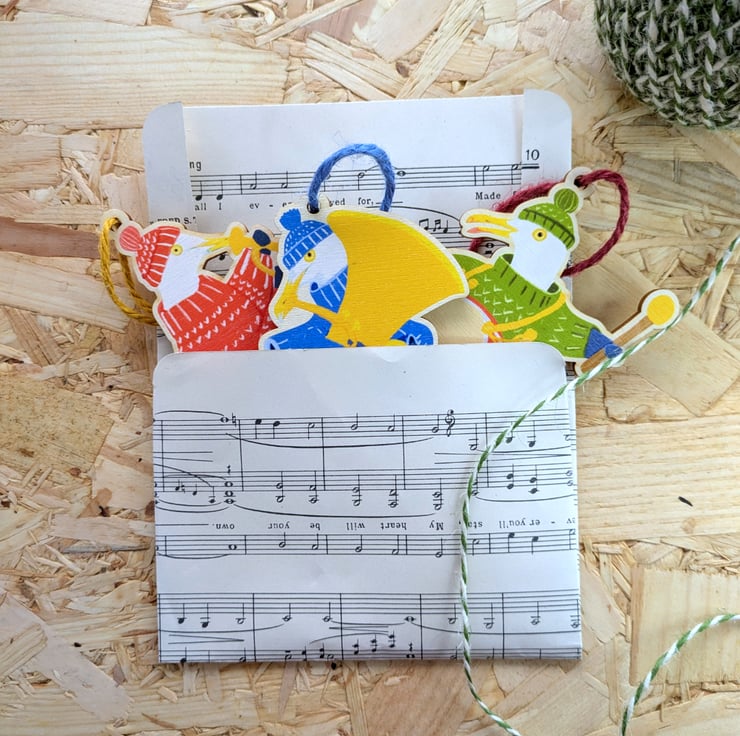 Unique illustrations by me The Hedgerow Artists printed in the UK on to sustainable wood. These fabulous little decorations can be bought individually or as a set. If you buy the set they will come gift wrapped in a handmade envelope created using old music sheets.