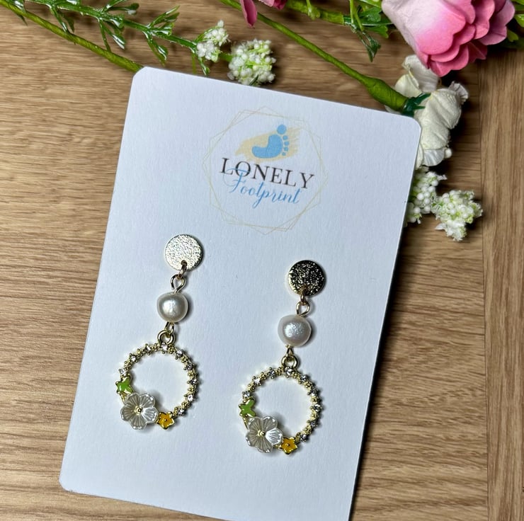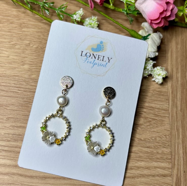 Pretty crystal and pearl earrings with floral and butterfly design.