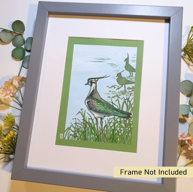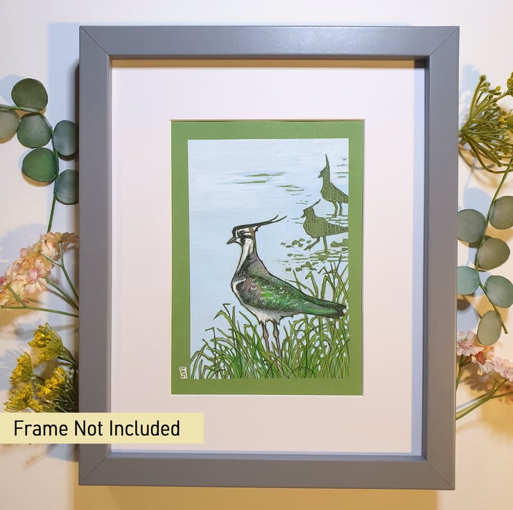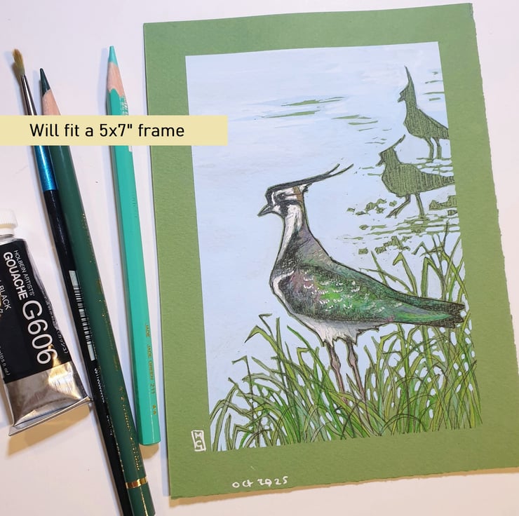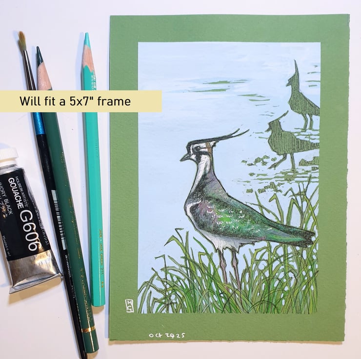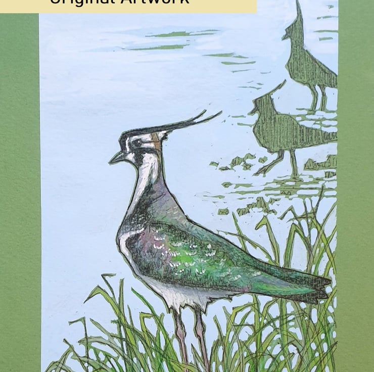 A small colour drawing of a Northern Lapwing bird, the drawing shows a bird standing at the edge of the water in grasses. There are silhouettes of two other birds in the distance.