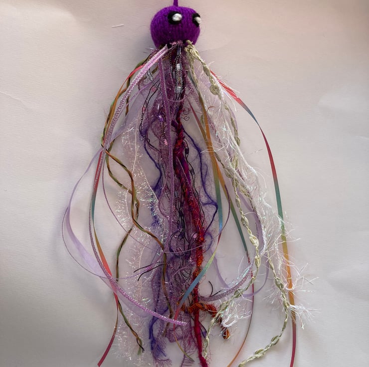 The purple jellyfish has trails of purple, pink,white, lilac and multi colours