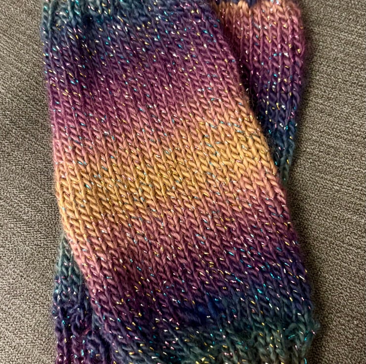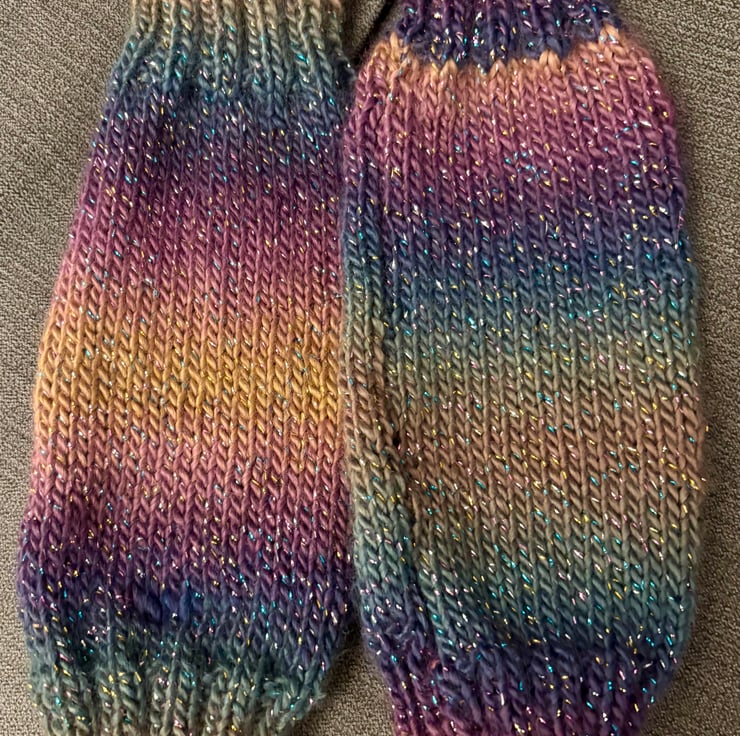 A pair of hand knitted fingerless wrist warmers. Knitted with Stylecraft Cabaret acrylic yarn these have a multi coloured sparkly thread running throughout. Warm but lightweight they will fit an average sized ladies hand. A gorgeous ombre mix of autumn colours.