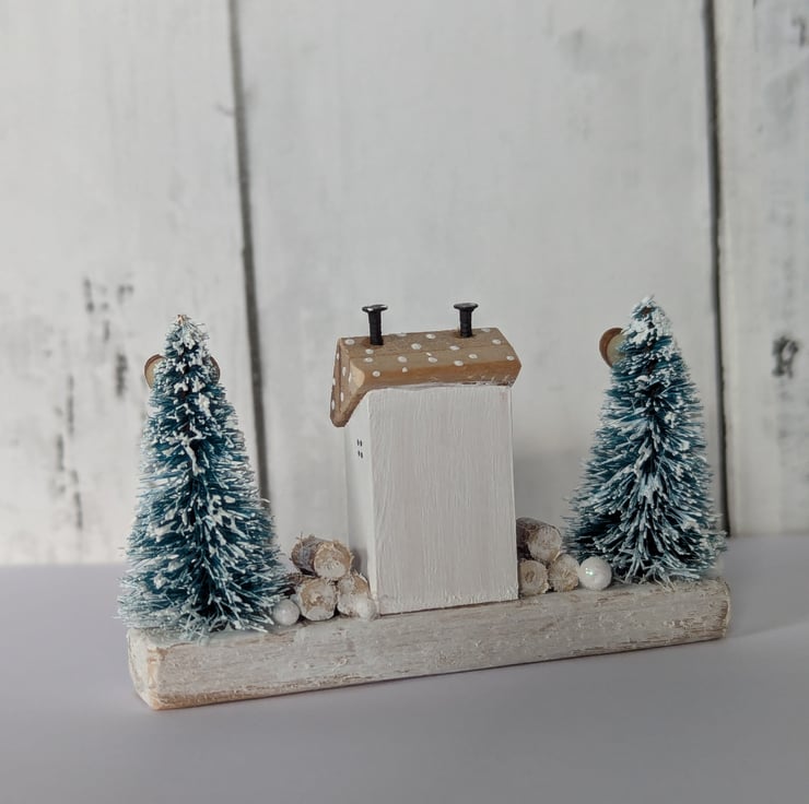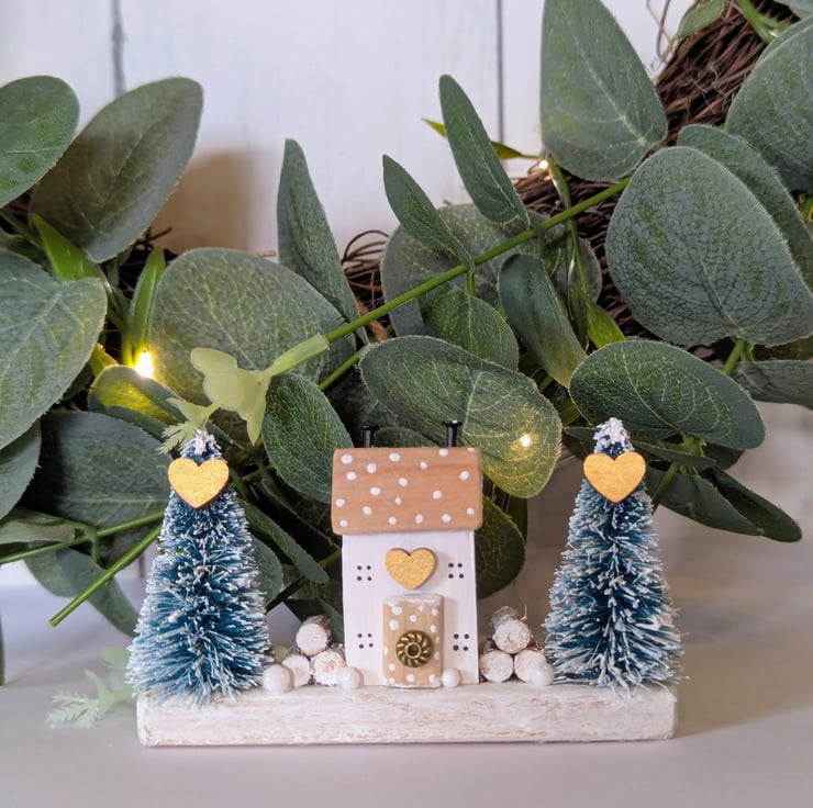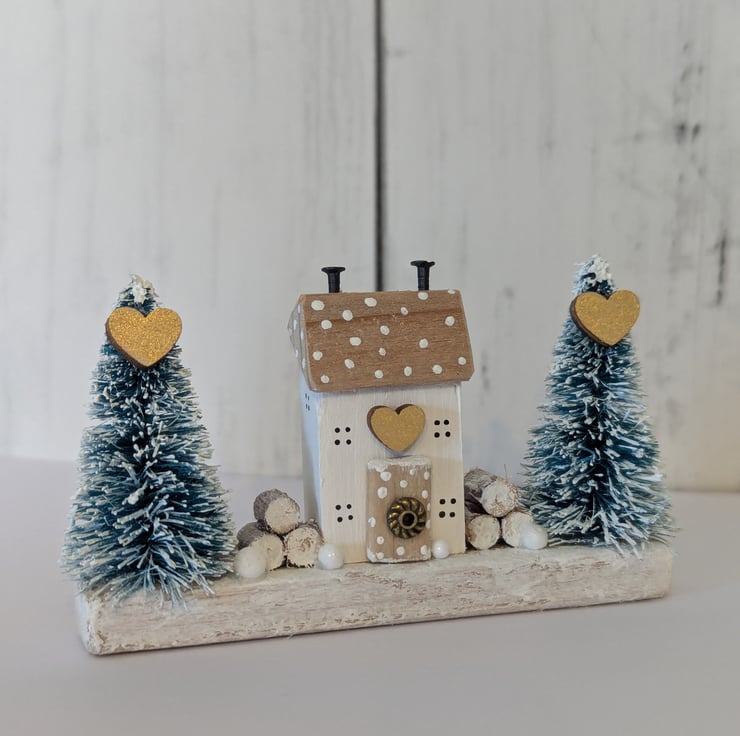 A tiny cosy country cottage with a wreath on the door, nail head chimneys and gold heart decoration is surrounded by log stacks ready for a cosy fire to sit by.