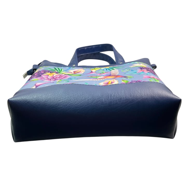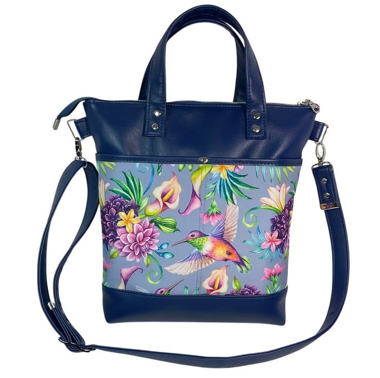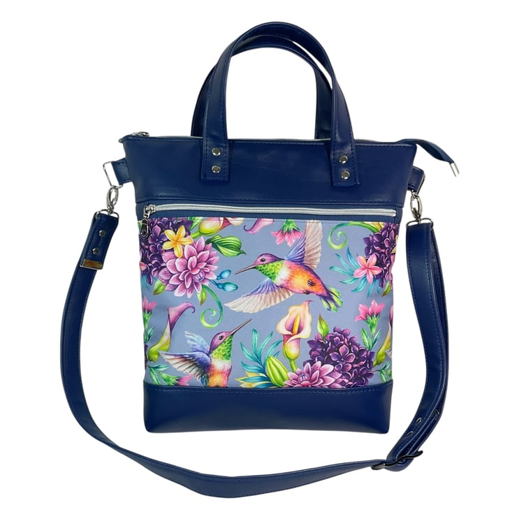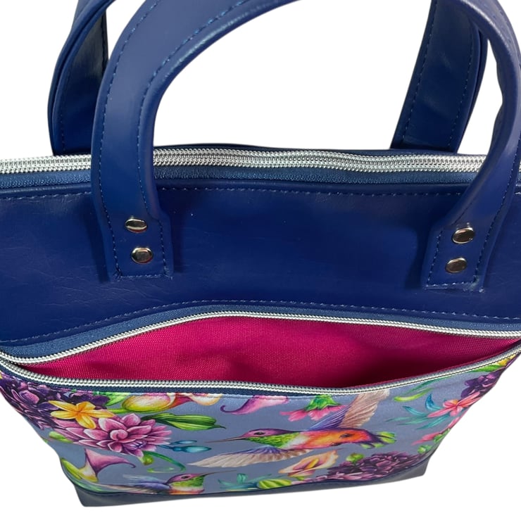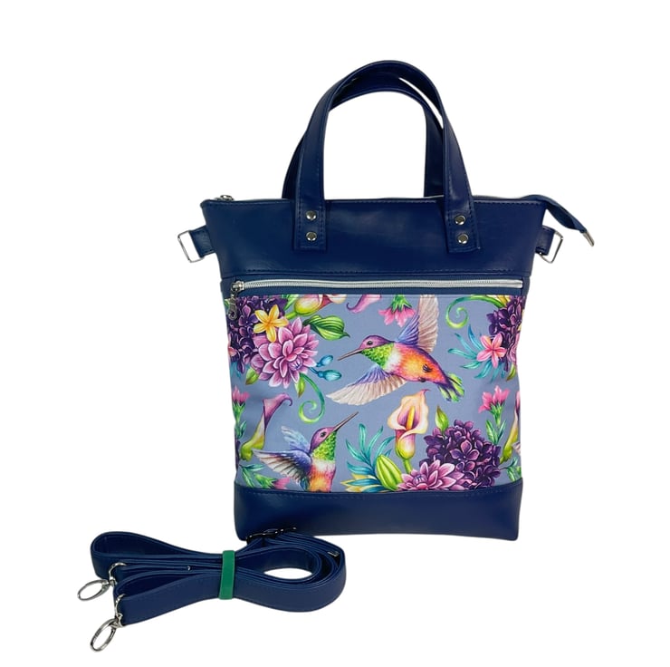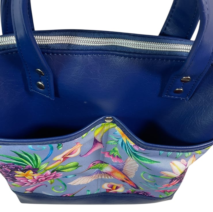 The outer and straps are made of a royal blue shade of vinyl/ vegan leather. It has been paired with a front pocket made in water resistant canvas fabric that features a pretty floral and hummingbird print on a smoky blue background.