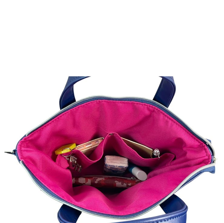 The bag is lined in cerise pink water resistant canvas and internally has a full width slip pocket on one side divided into 2.