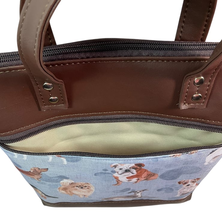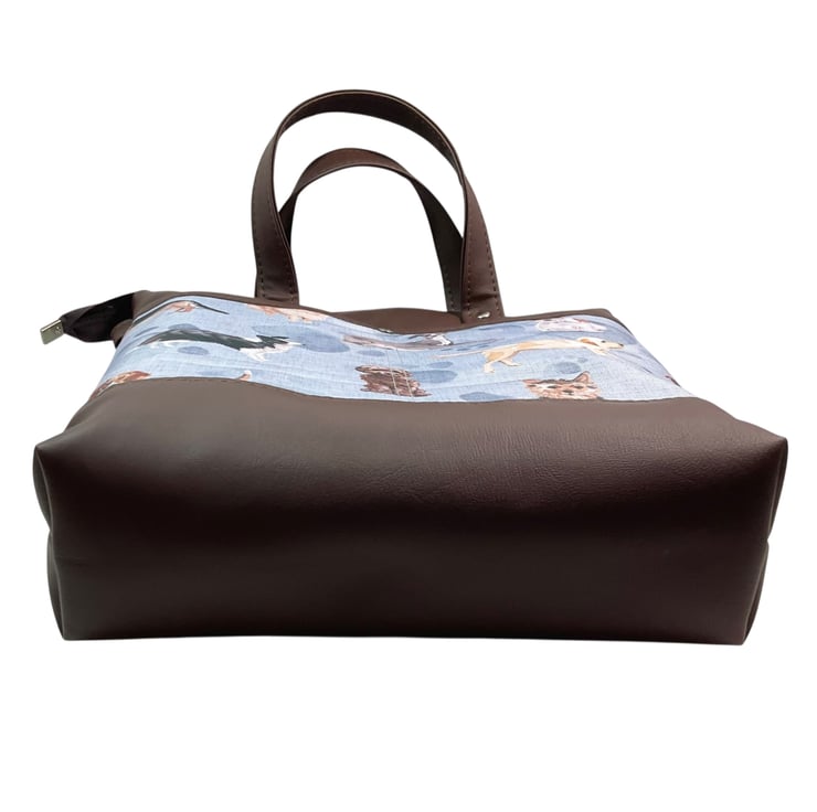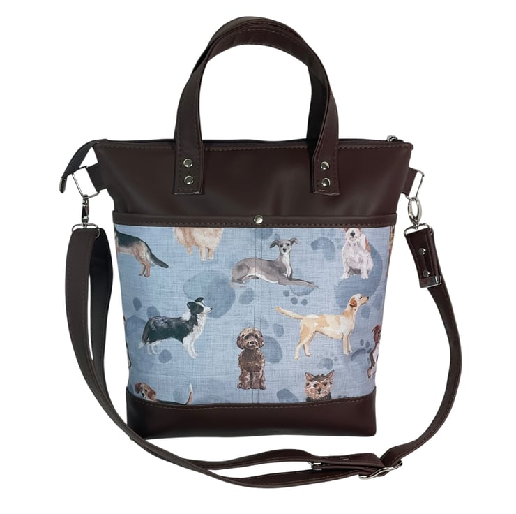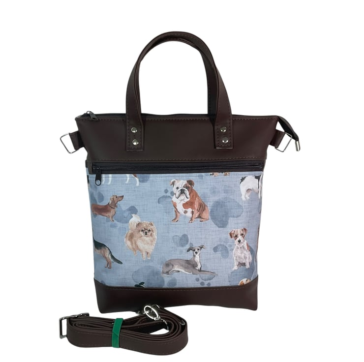 The outer and straps are made of a chocolate brown shade of vinyl/ vegan leather. It has been paired with a front pocket made in water resistant canvas fabric that features a realistic various breeds of dogs print on a grey background.