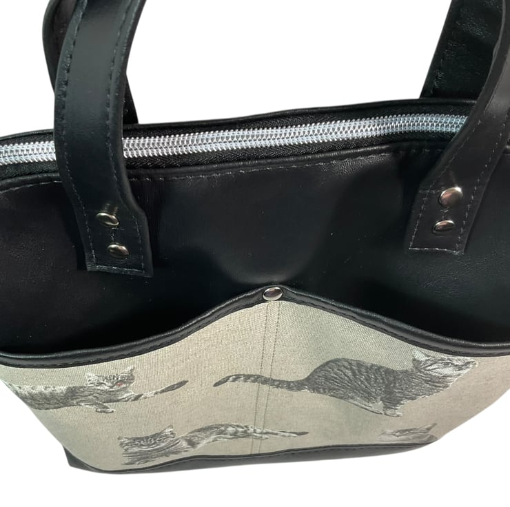 The bag is lined in light beige water resistant canvas and internally has a full width slip pocket on one side divided into 2.