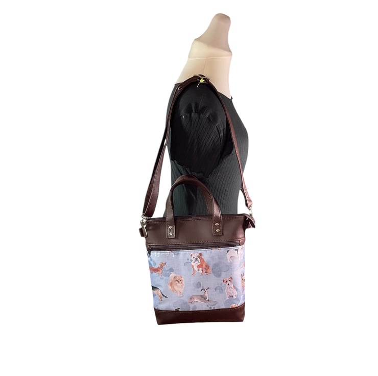 The outer and straps are made of a chocolate brown shade of vinyl/ vegan leather. It has been paired with a front pocket made in water resistant canvas fabric that features a realistic various breeds of dogs print on a grey background.