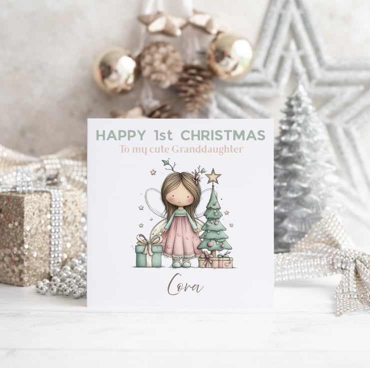 Personalised Christmas Card with cute fairy and christmas tree - 1st Christmas