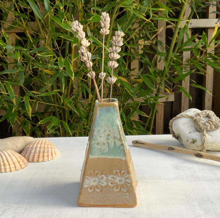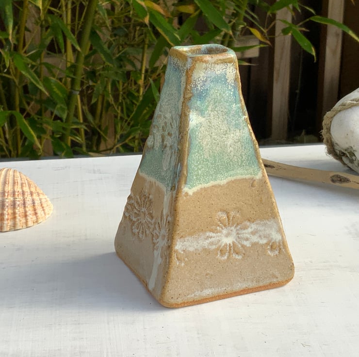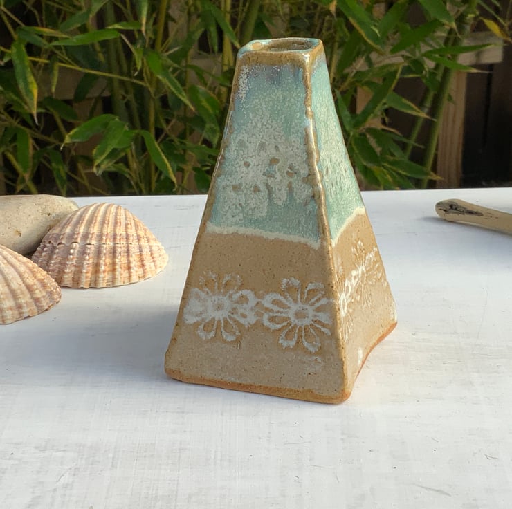 A beautiful hand-built square based bud vase. Pressed floral impressions and a soft blend of Winter Wood and Aurora Green glazes give it a soft organic feel. Perfect for a few garden stems or dried grasses.