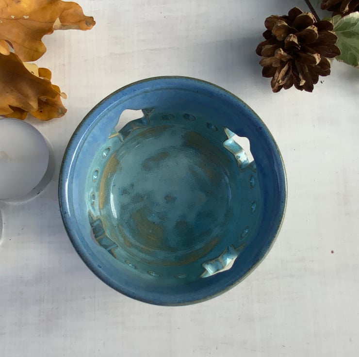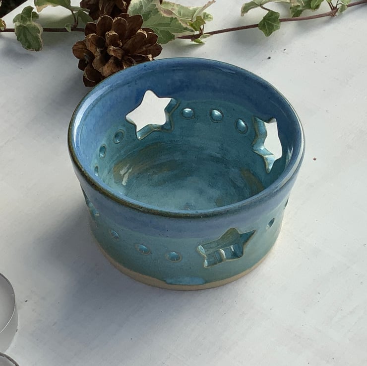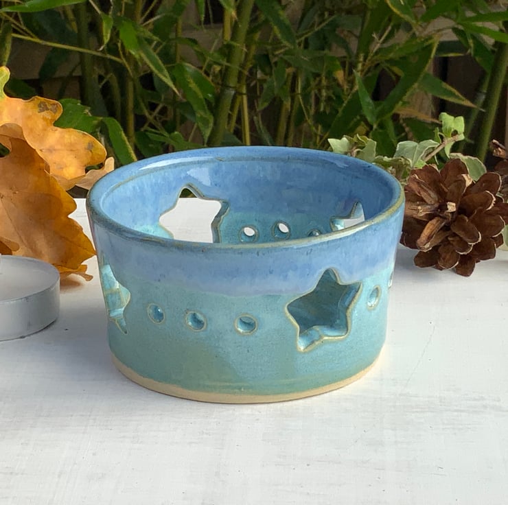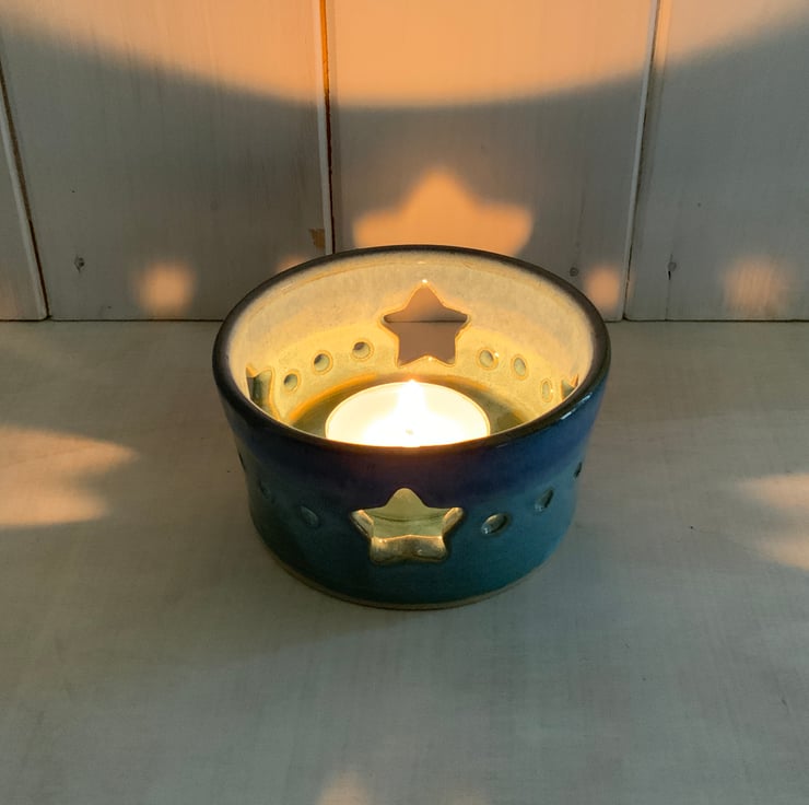 Bring a touch of charm to your home with this hand thrown candle holder. Lovingly crafted on the wheel using stoneware clay and finished in a blend of Midnight Rain and Norse Blue glazes. Hand-cut star windows cast a gentle glow of candlelight, filling your space with warmth and calm.