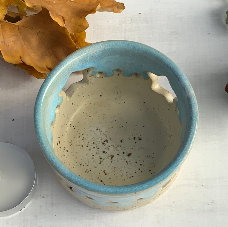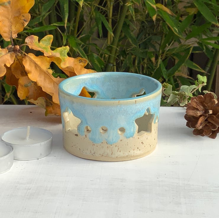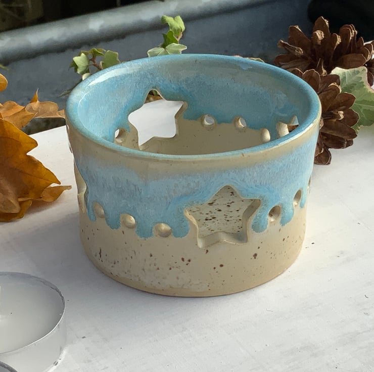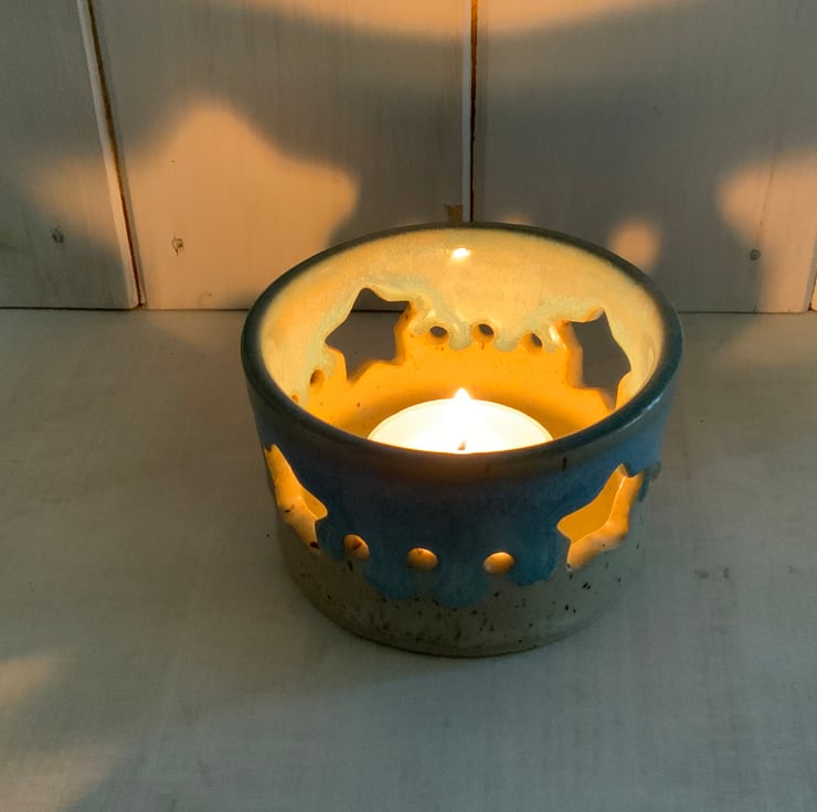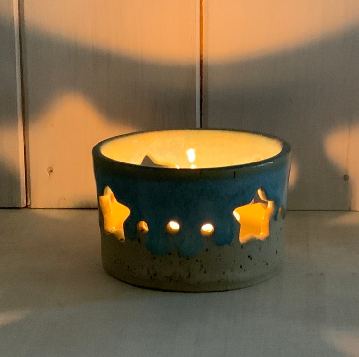 Bring a touch of charm to your home with this hand thrown candle holder. Lovingly crafted on the wheel using stoneware clay and finished in a blend of Winter Wood and Norse Blue glazes. Hand-cut star windows cast a gentle glow of candlelight, filling your space with warmth and calm.