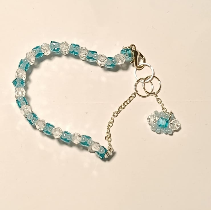 This unique piece is made of 4mm transparent blue square crystal beads, 1mm light blue glass beads and 4mm clear transparent bicon beads . Also has a handmade charm attached to the end that will dangle from your wrist after fastening.
