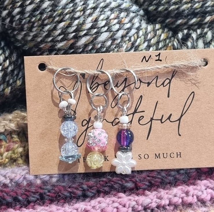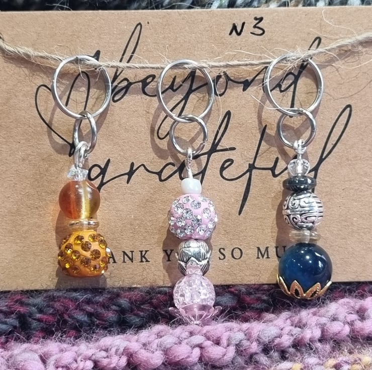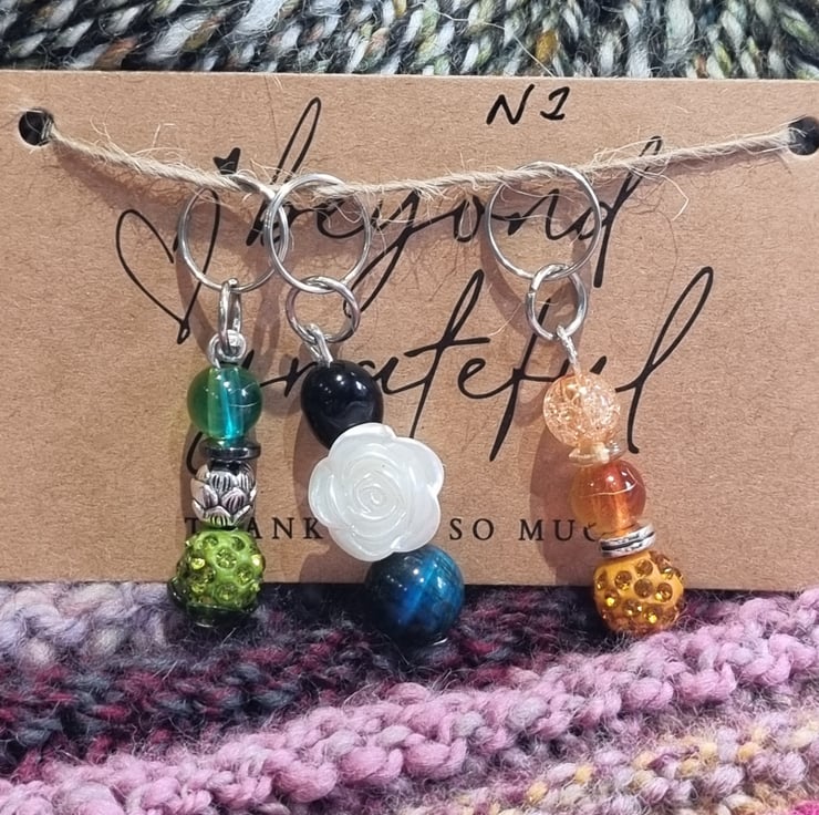 Handmade stitch markers made up of different beads and round rings to pop into your work.