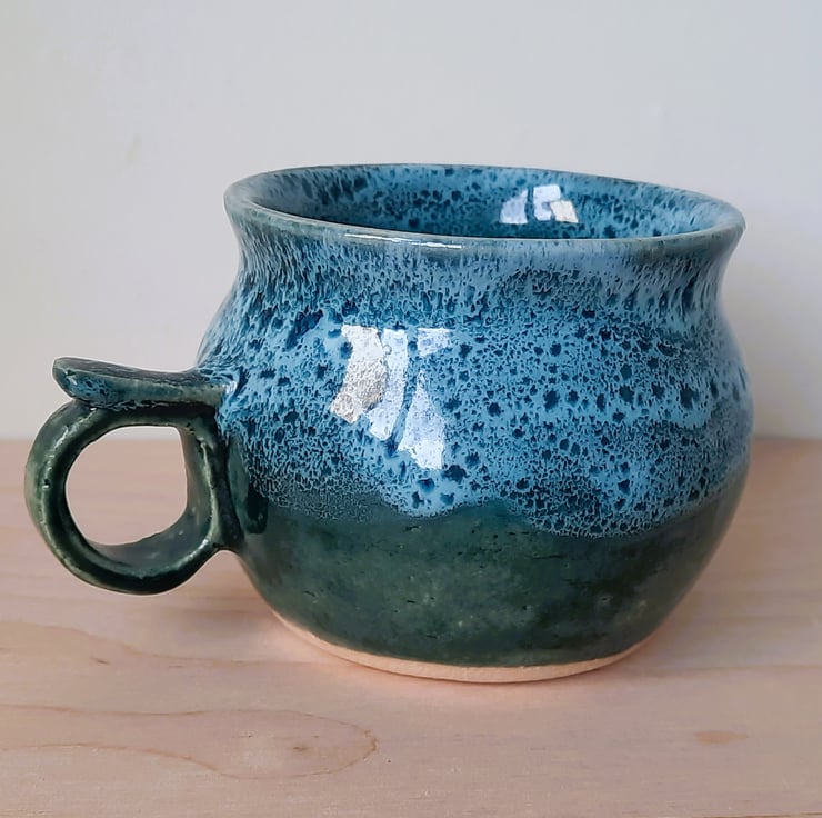 A hand thrown stoneware mug with a variegated glaze reminiscent of a snow storm over a dark green landscape. Suitable for coffee, tea, hot chocolate or what ever your favorite warming drink might be. Comfortable to hold and sip from.