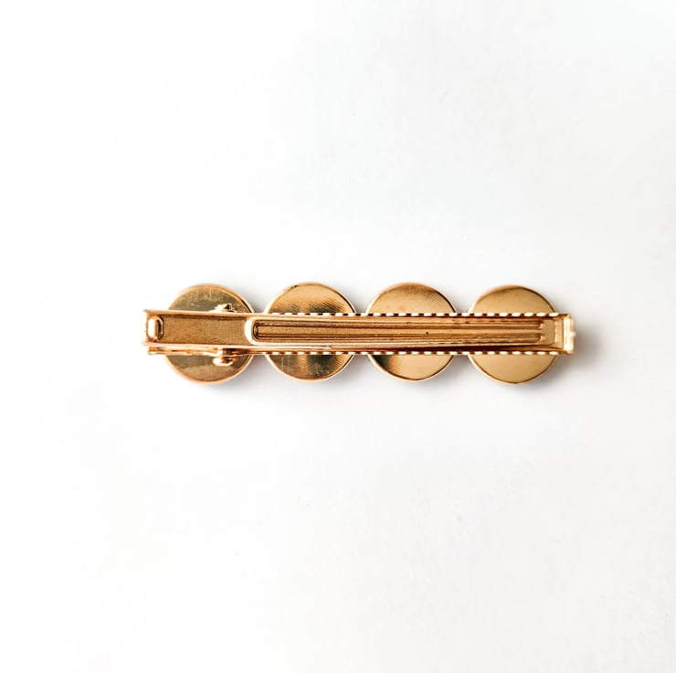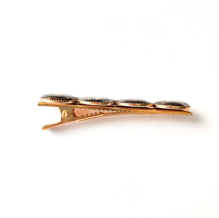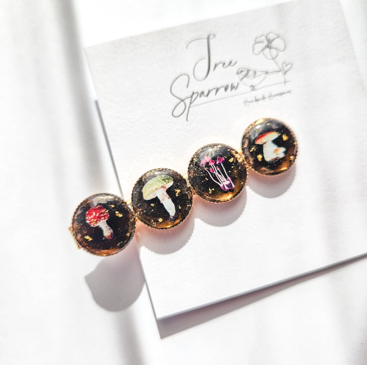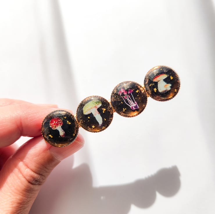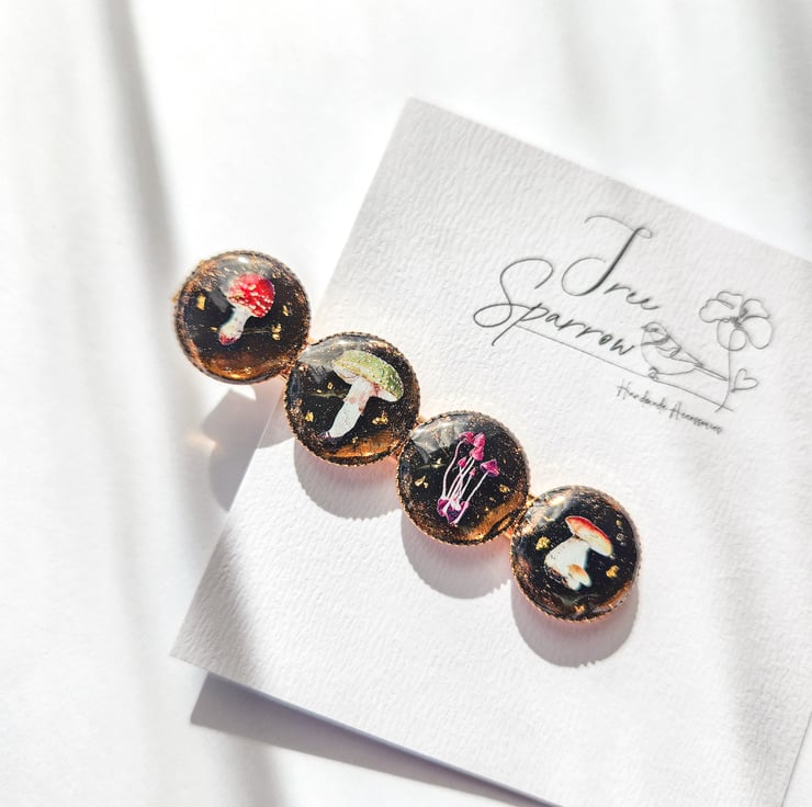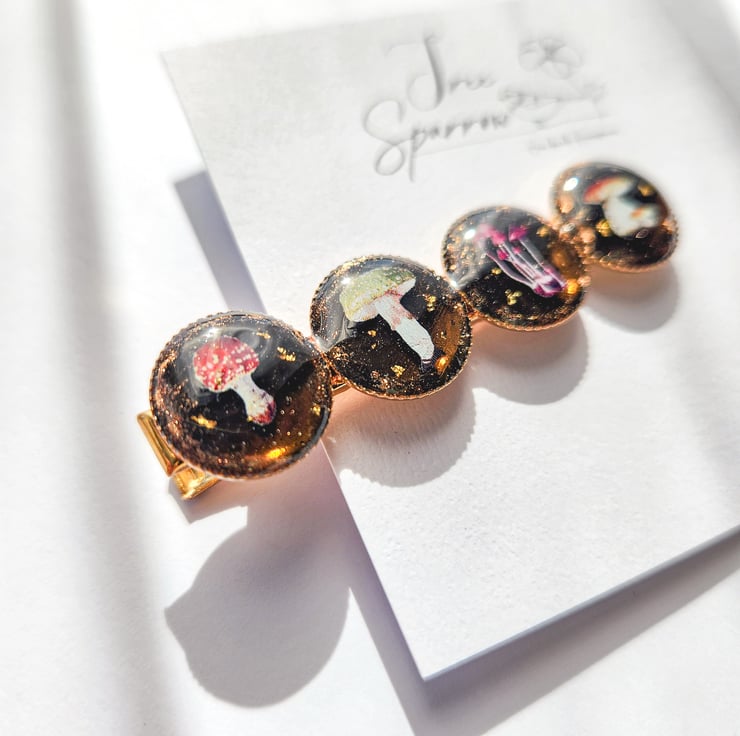 A woodland-inspired hair clip featuring tiny mushrooms set in glossy resin with gold flakes.