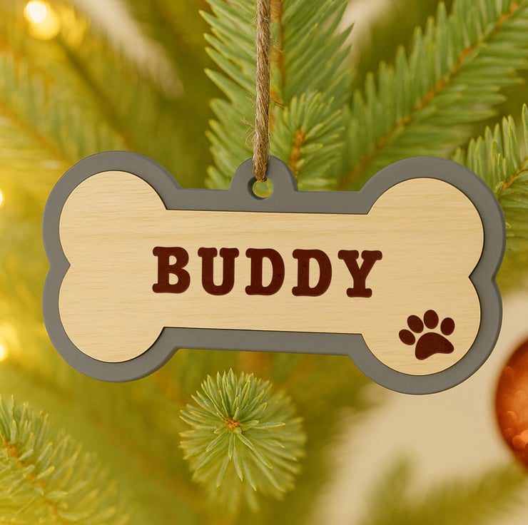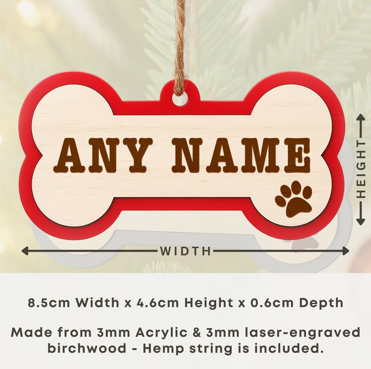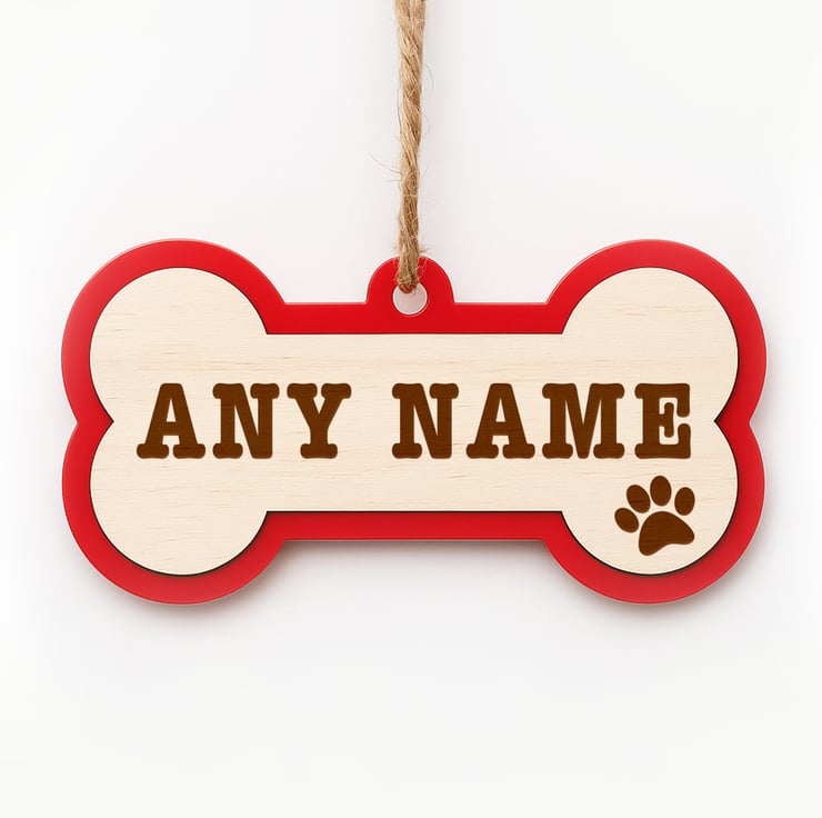 Celebrate your loyal companion with this classic block font dog bone ornament, perfect for hanging on your Christmas tree or gifting to a fellow pet lover. Each piece is precision laser-engraved on natural birchwood and paired with a layered acrylic base in your chosen colour. Sturdy yet stylish, it’s a festive keepsake you’ll treasure year after year.