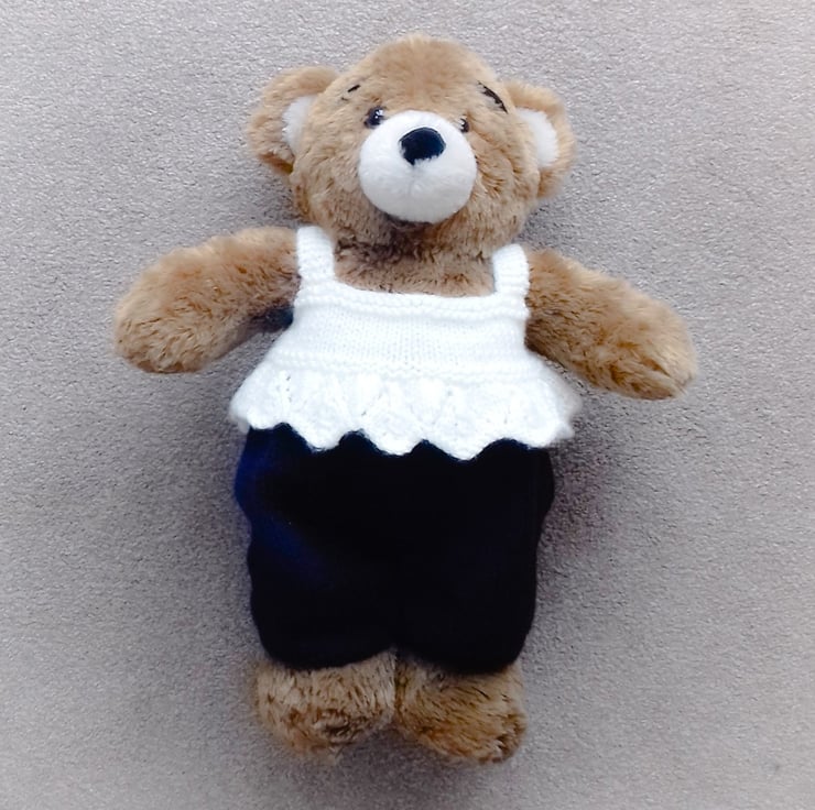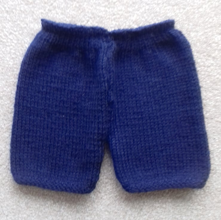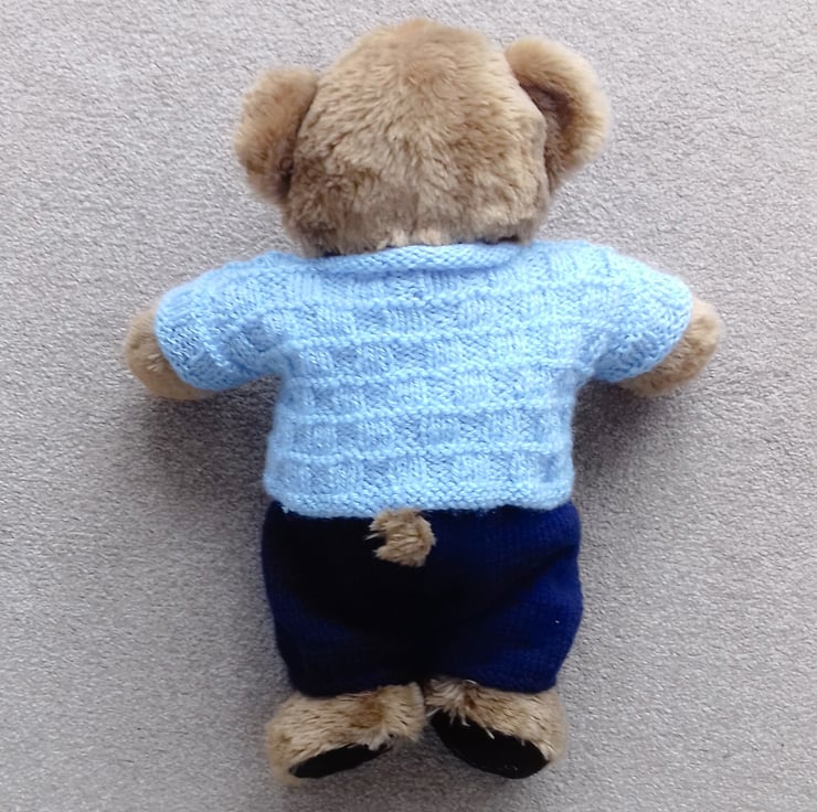 This hand knit PATTERN is for a pair of trousers for a Teddy. To fit Teddy height: 38 (43: 48) cm or 15 (17: 19) inches. The trousers are knitted in double knitting yarn using 3.25 mm and 4 mm knitting needles.