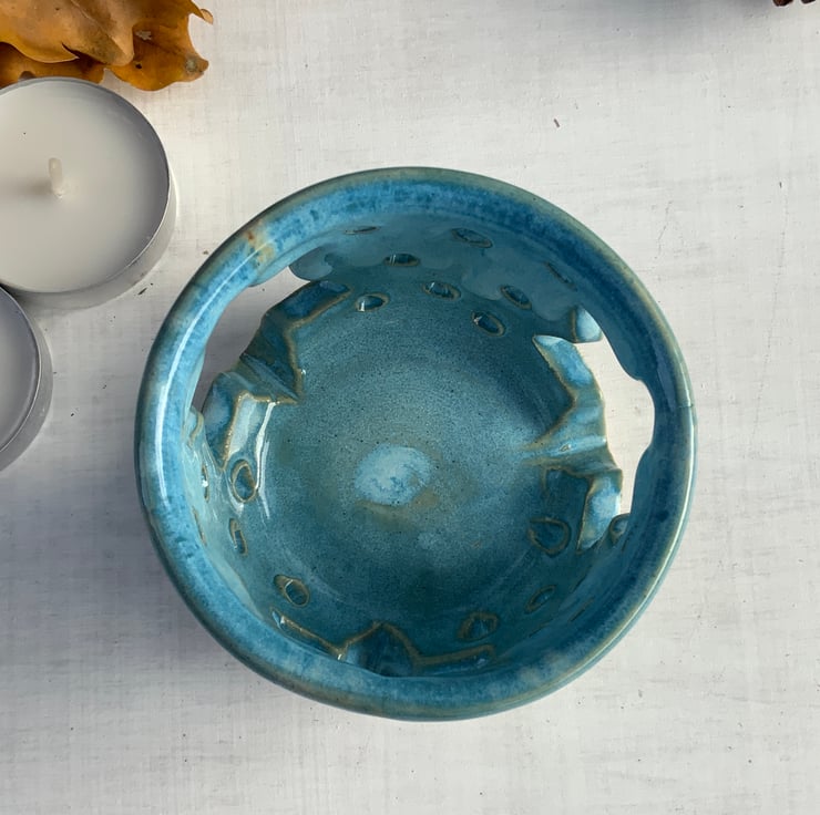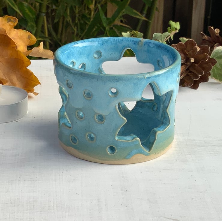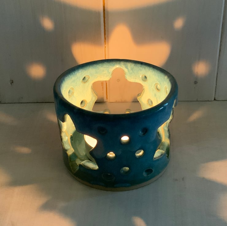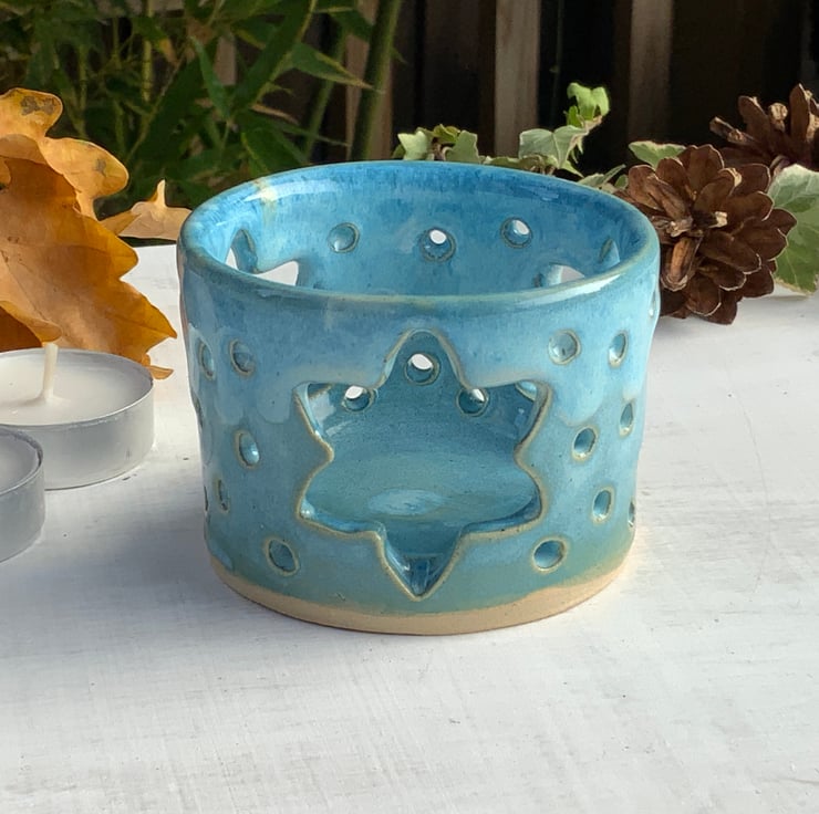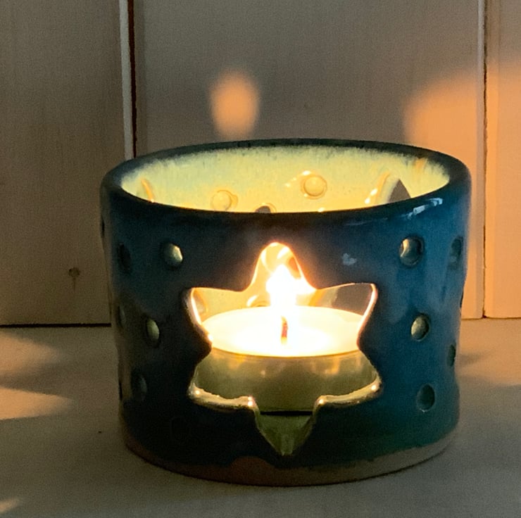 Bring a touch of charm to your home with this hand thrown candle holder. Lovingly crafted on the wheel using stoneware clay and finished with Norse Blue glaze. Hand-cut star windows cast a gentle glow of candlelight, filling your space with warmth and calm.