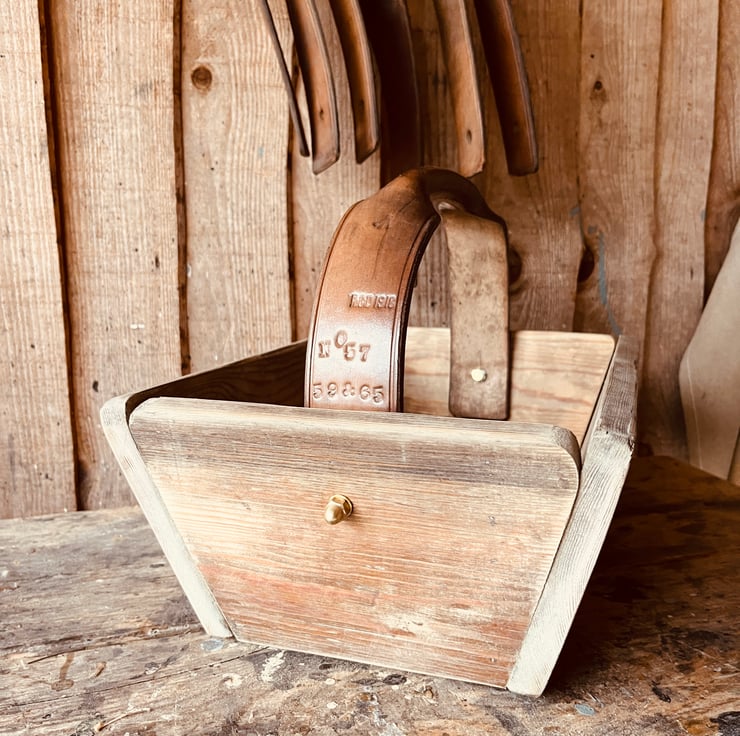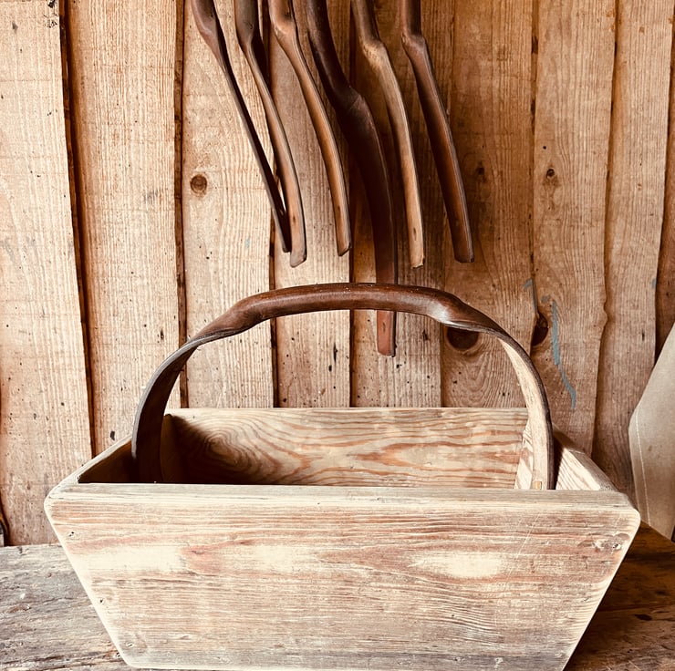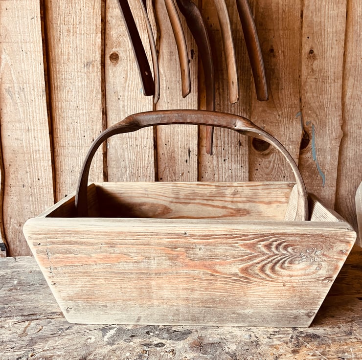 This trug is made from an old salvaged shelf, it could be pine, it’s certainly been around for a long time and carries its patina proudly.