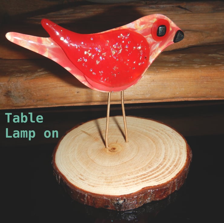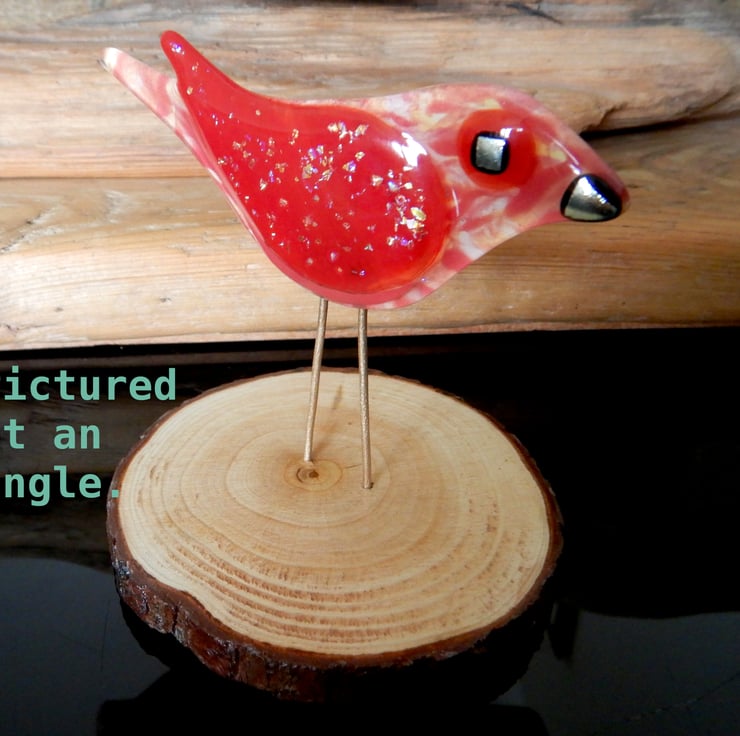 The little bird's legs are made from copper wire that has been fused into the bullseye glass in the kiln.