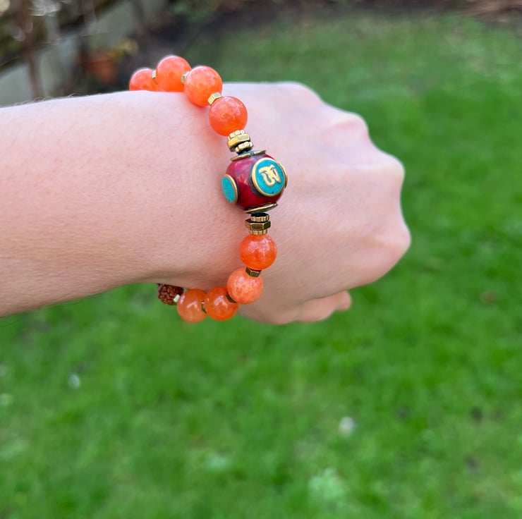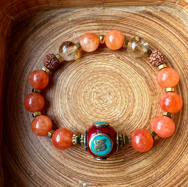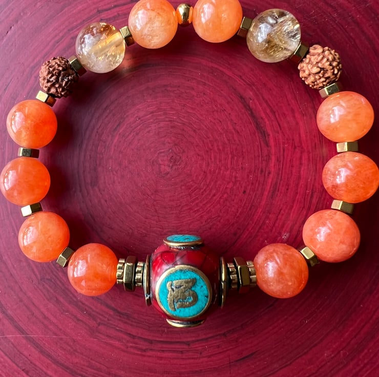 A vibrant bracelet featuring Sunstone,citrine,rudraksha,gold hematite spacers,and a Tibetan OM bead inlaid with turquoise and coral.