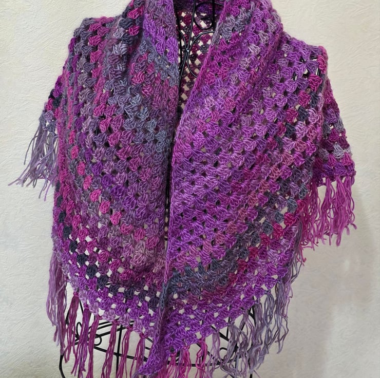 Triangle fringed shawl using granny square cluster stitch. This is a beautiful piece which is light weight and will be warm to wear due to being 100% wool. It is extremely soft. The vibrant colours are stunning.