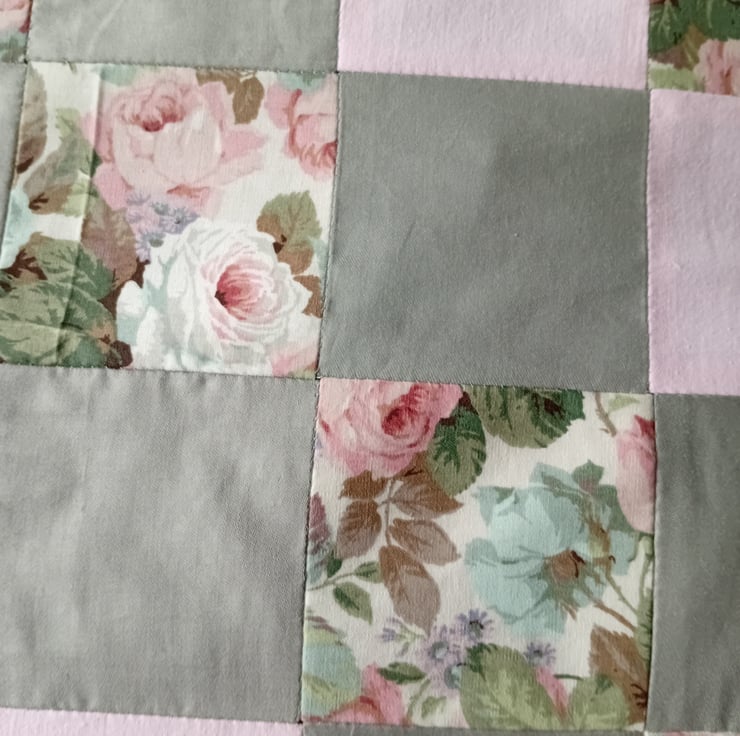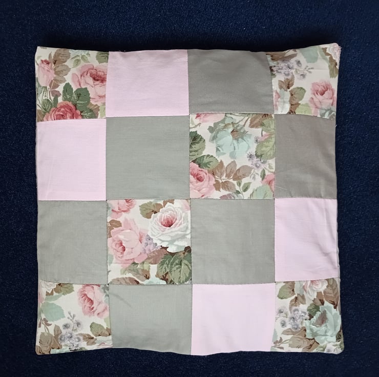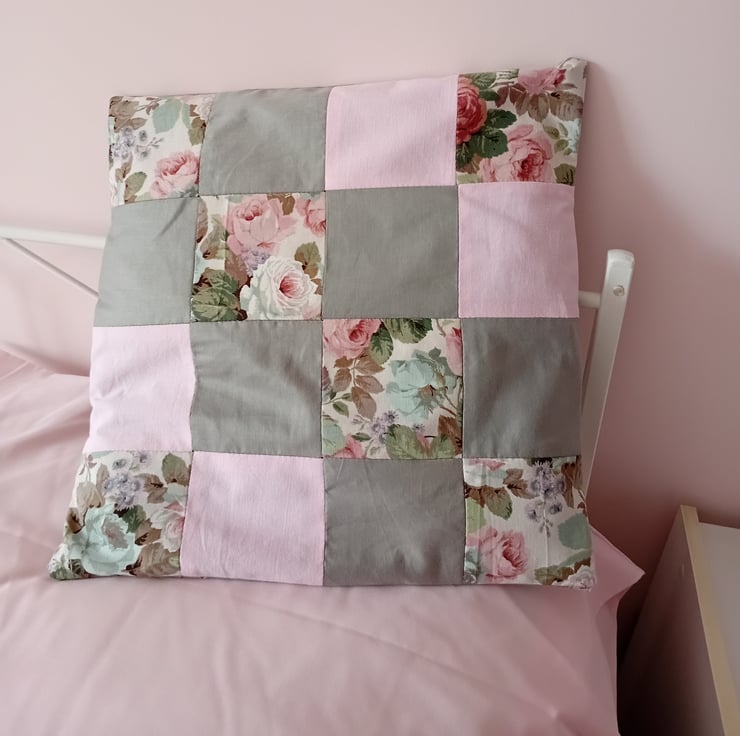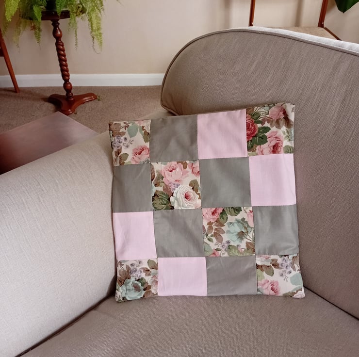 Patchwork cushion cover made with handsewn squares of pale pink, grey and a floral, which is a remnant of a Sanderson fabric.