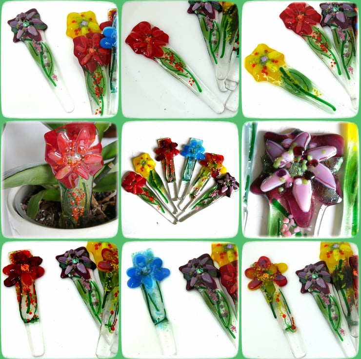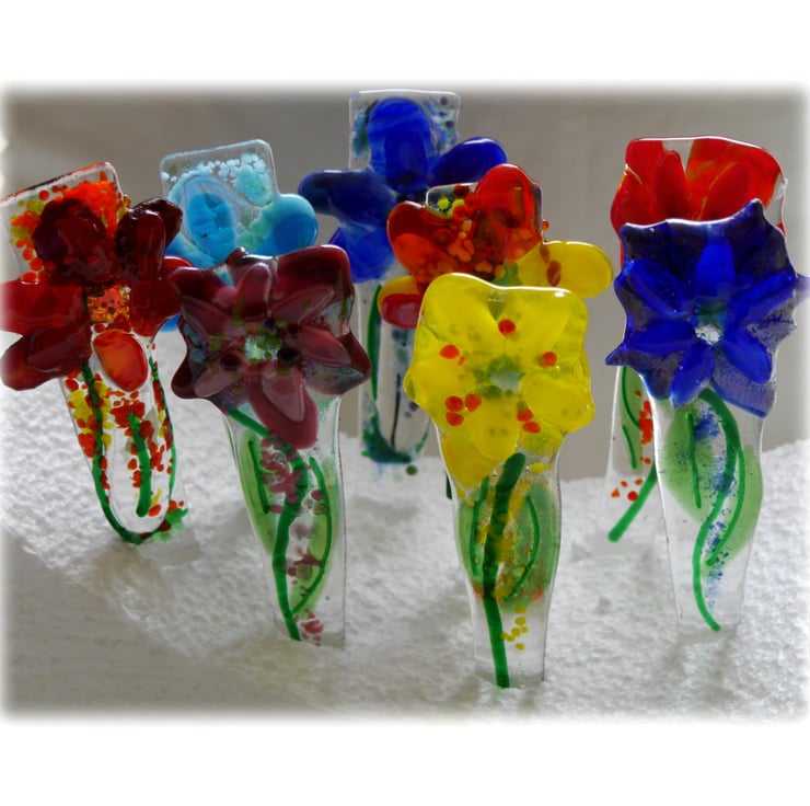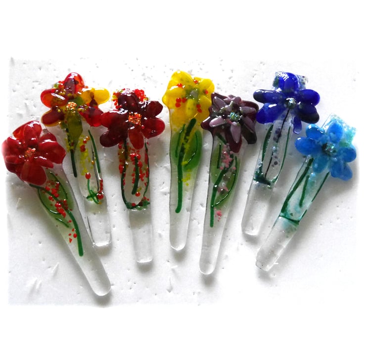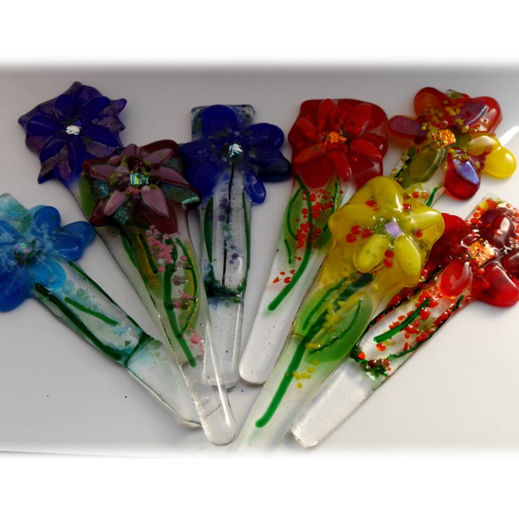My glass fusing kiln is only small so these fused glass pieces are all one-off designs, no mass production possible. The stakes are all topped with a multi petal flower at the top and with a sparkle of dichroic glass in the centre.