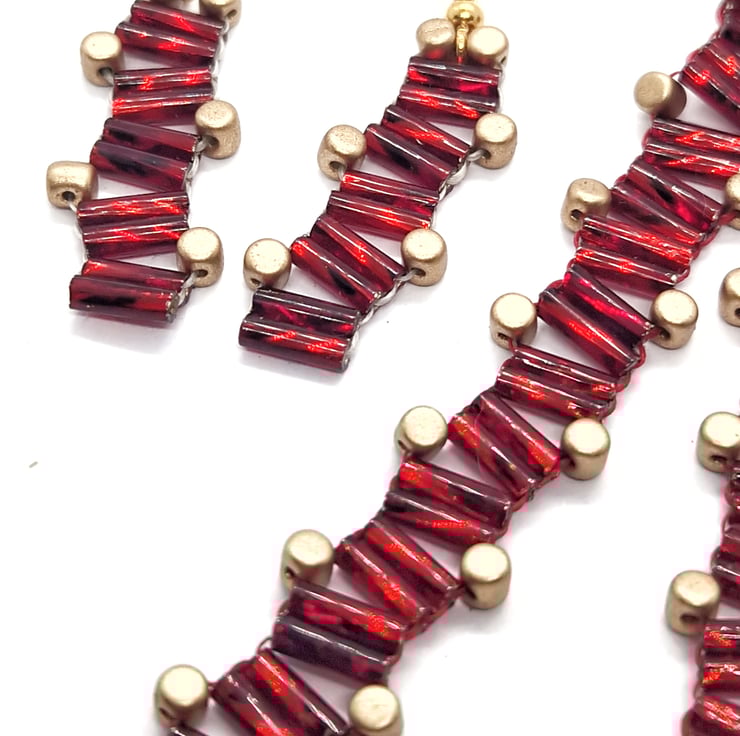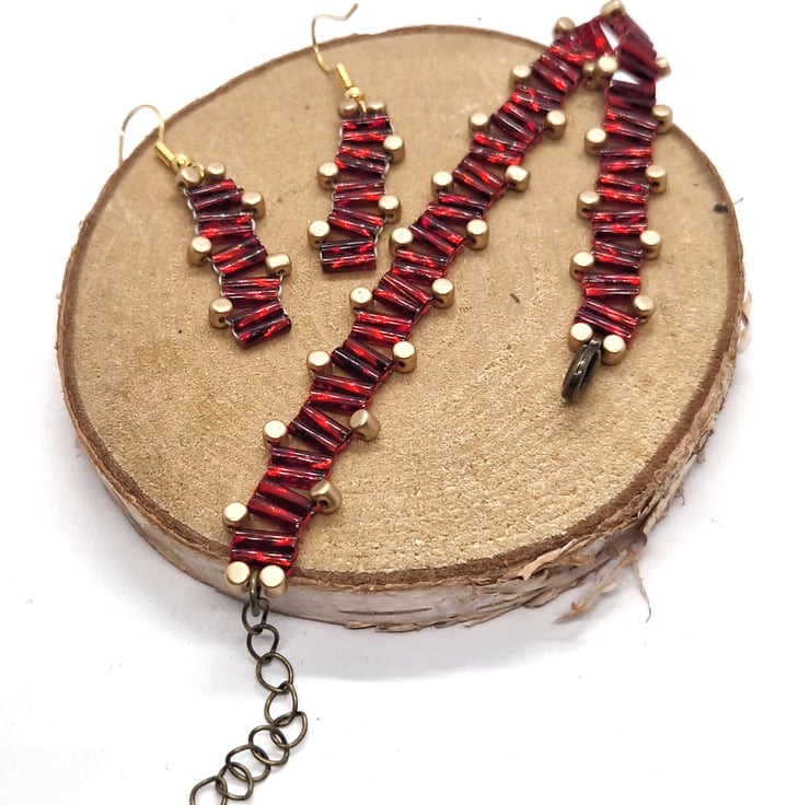 This shimmering red and gold Christmas beaded bracelet and earrings set is carefully and lovingly made with festive, shimmering red bugle beads and gold pebble beads, with antique gold and gold plated findings.