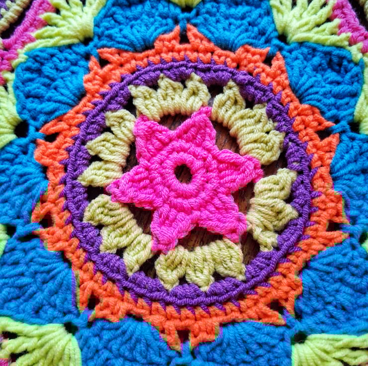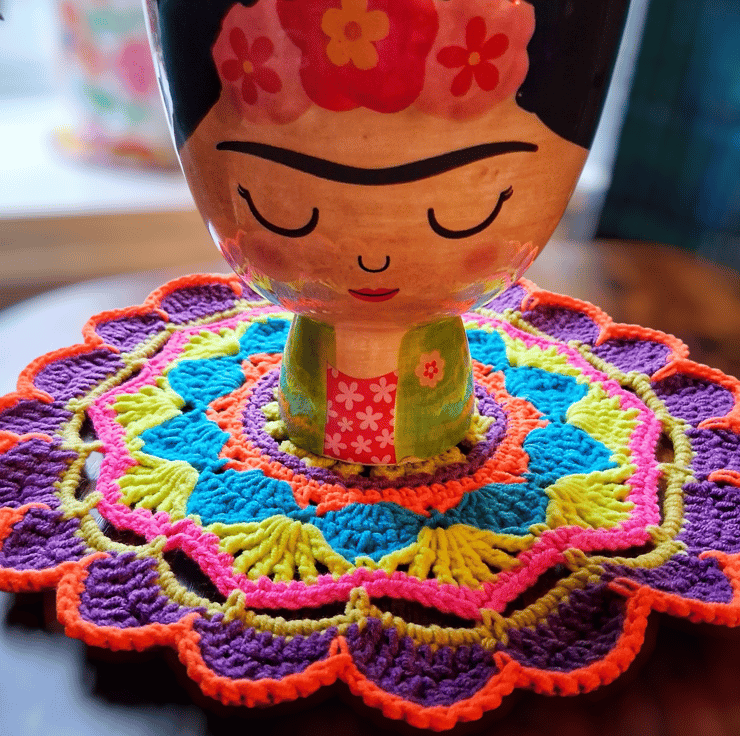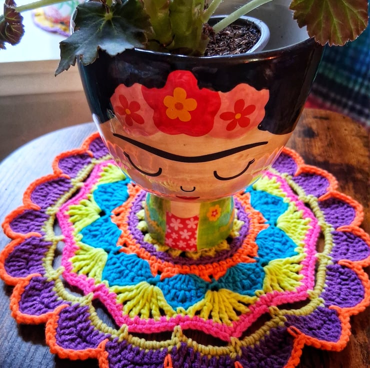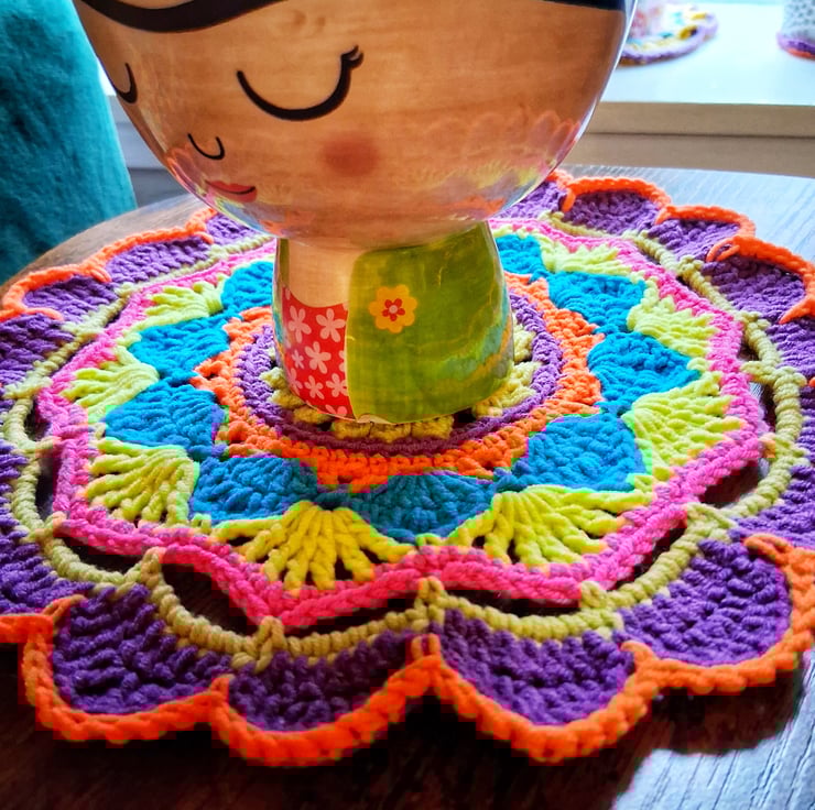 This mandala doily will certainly make your table pop. Crocheted in soft cotton blend yarn, 24 cm diameter.