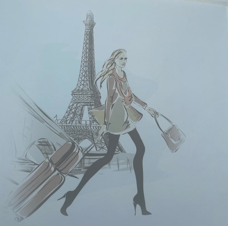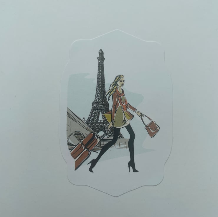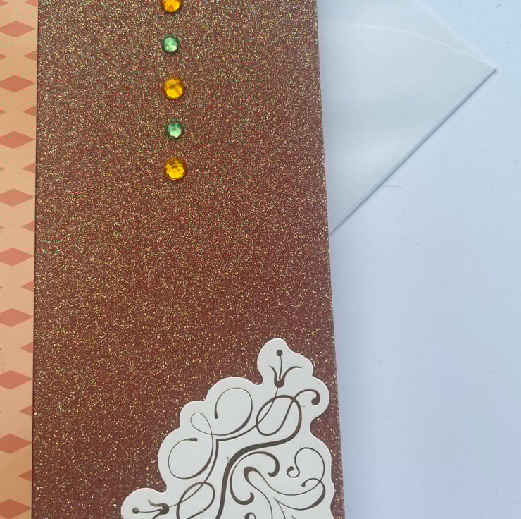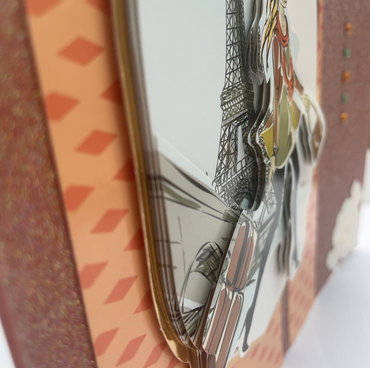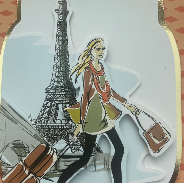 A sparkling and sophisticated card. This 20x20cm card has a bronze glitter background. This is topped with orange two tone card with a diamond design. The main design is gold edged and features a layered design of a woman dashing with her suit cases in front of the Eiffel Tower. She is dressed in green, brown and orange with matching brown luggage. The design is finished with gold corner swirls and matching faux gems. Inside has a matching insert with no greeting so the card is great for any occasion you want. Greetings can be added if you want.