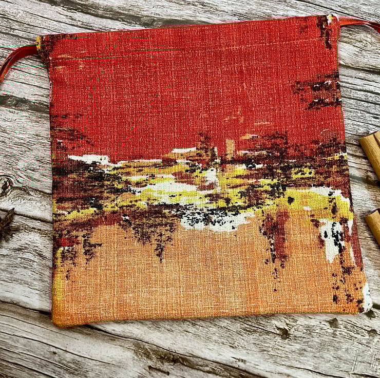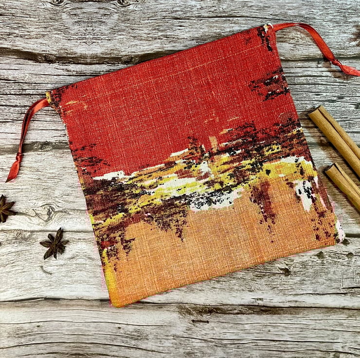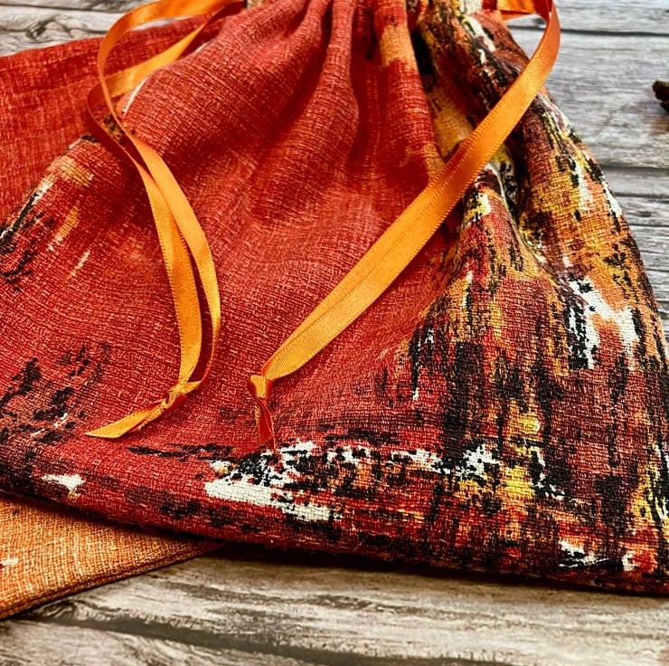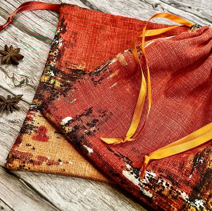 These drawstring bags are all one-offs, entirely hand made by me in my studio in Oxfordshire. The pattern placement may vary from the ones pictured to ensure each bag is unique. Please let me know if you have a preference on the colour of the ribbon.