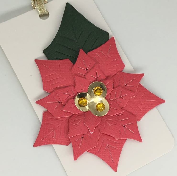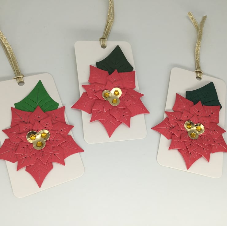 A set of 3 gift tags with a die cut poinsettia design. Each flower has been created using four layers of quality, textured card. The centres have been cut from gold mirror paper and then embellished with gold adhesive gems. Each tag has a different coloured green leaf, cut from textured paper. The tags are finished with a length of sparkly gold coloured ribbon. .