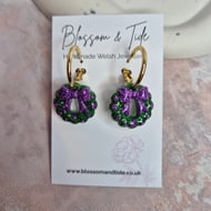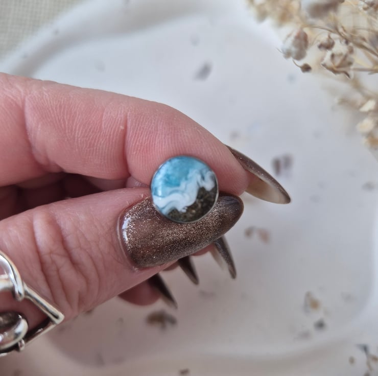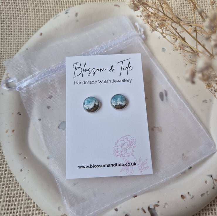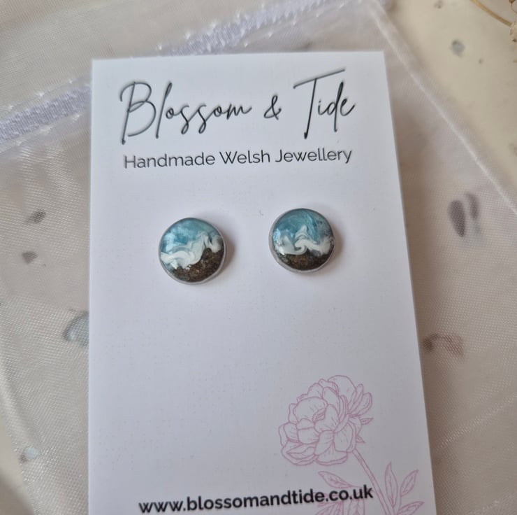 Carry a little piece of the Welsh coast wherever you go with these stunning round stud earrings, handmade with real sand collected from the beautiful beaches in Wales. The earrings captures the essence of waves crashing to shore, with golden sand settling at the bottom, a blue sea above, and delicate white ripples mimicking the frothy surf.
