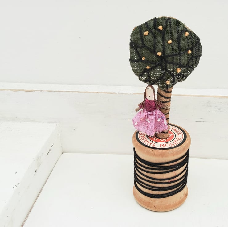 The little tree is made from linen and cotton fabric that has been entirely hand stitched and then embroidered. The little lady has been made from papier mache ,with a painted face . She has been wrapped with embroidery thread for her upper body and her skirt is a tiny piece of cotton fabric. She is little bit bigger than a Guatemalan worry doll and I based her on the 6 that I have in a little bag !