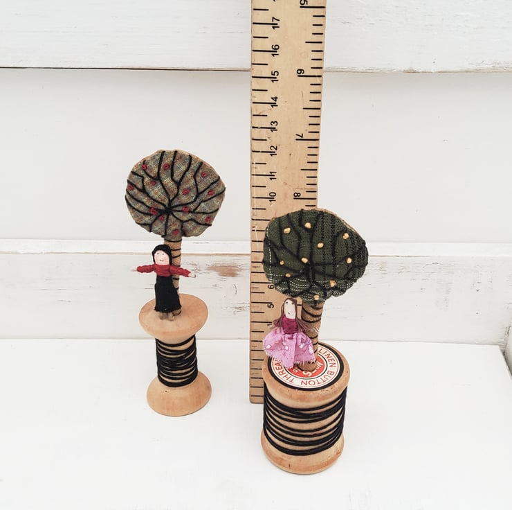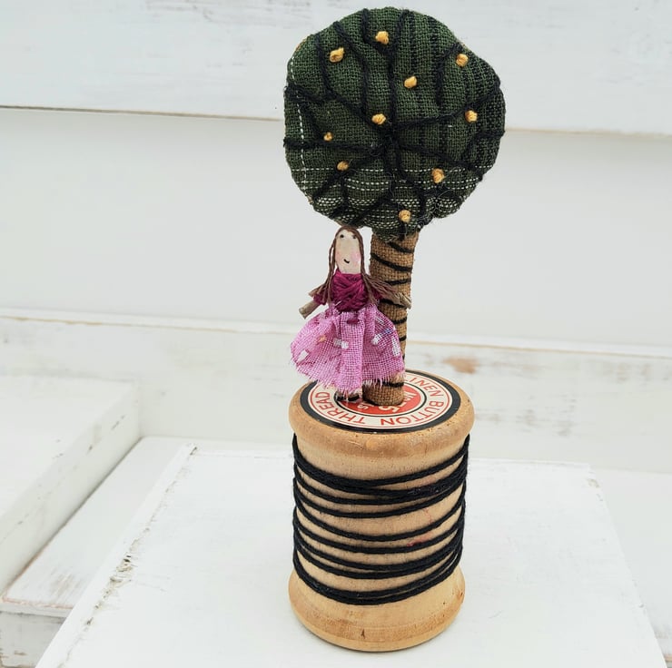She is about 3 cms tall, the tree is about 7.50cms and the bobbin is a little over 4 cms. The whole ensemble is just short of 12cms. The vintage bobbin has been wrapped with embroidery thread. That's it!