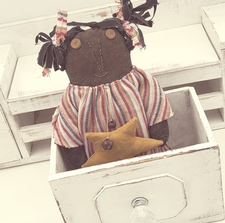 This little girl is made from calico which has been painted with black acrylic paint and then sanded back for a vintage look. Her eyes are linen buttons and she has her other features stitched with linen thread. Her hair is ripped fabric,her dress is a soft cotton fabric and has been trimmed with rusty bells. She holds a painted star .