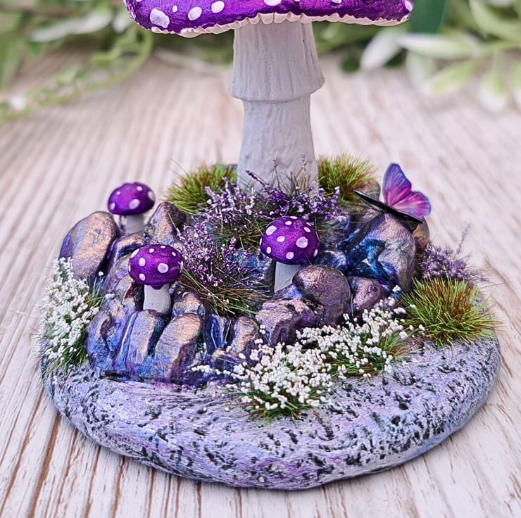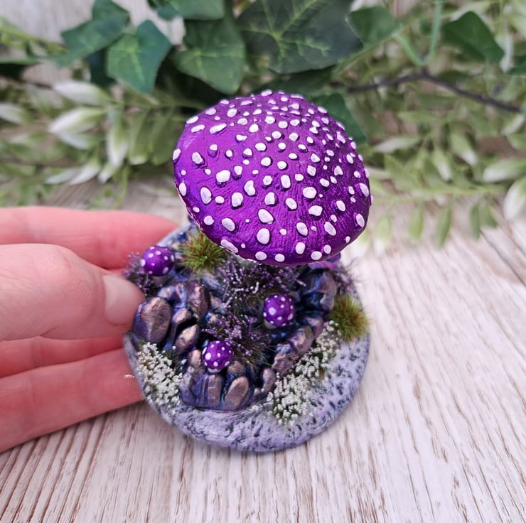 This miniature handmade mushroom scene is sculpted from air drying clay and finished in a shimmering metallic purple that really catches the light. The base is built on MDF and covered in textured clay, decorated with crystal like rock formations painted in blues, purples and touches of gold for a magical effect.