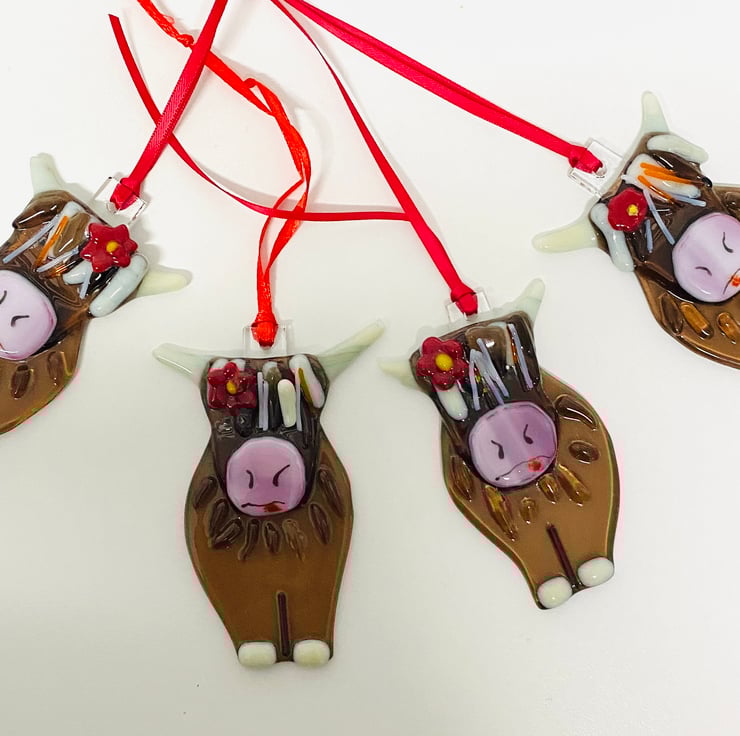 If like me you like highland cows you will love a fused glass Gertie on your Christmas tree . She is super cute and even has a fused glass flower in her hair . Hand created from coloured art glass and fused in my kiln . The cows are created from brown transparent glass with opaque horns, nose and flower . They are then drilled and strung with satin ribbon ready to hang on the Christmas tree. A lovely gift for the highland cow lover . Approximately 3.5 inch tall