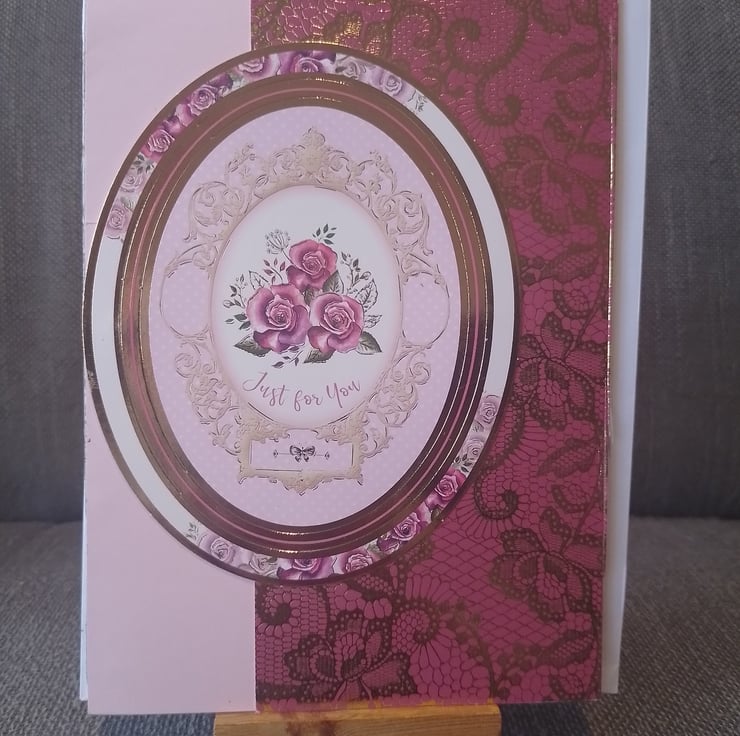 A 9 x 6" pink congratulations/ birthday card showing a picture of roses in an oval-shaped window, all cards come with envelopes and cellophane wrapped to keep them clean just for you sentiment on this card with a bunch of pink roses