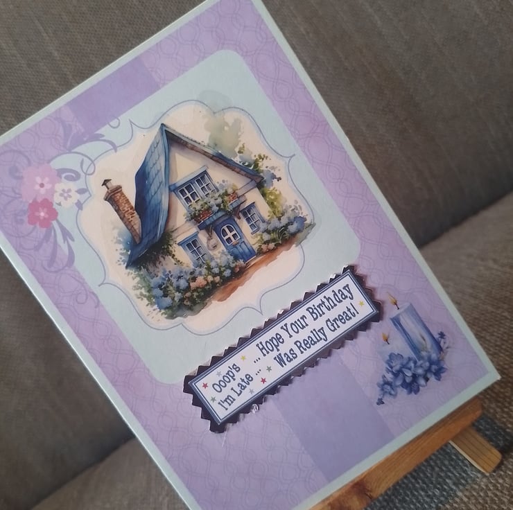 A 6" x 4" card showing a small cottage with the sentiment saying "Oops, I'm late". All cards come with envelopes and cellophane wrapped to keep them clean. It's always easy to miss a birthday with busy lives, so this pretty card will go towards apology