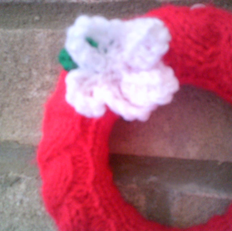 This mini wreath is made using an 11cm polystyrene wreath ring and the covered with a handed knitted cover in red acrylic yarn and embellished with white flowers. It had a small loop on the reverse so you can hang it up easily.