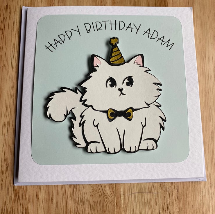 Beautiful hand crafted 15.2cm square cards, I have attached versions I have made already for friends and family, I can make with either of the cats used in these pictures or if you have a preference in cat breed or colour, let me know and I can try and create exactly what you want. I can add any message on the front and inside. You can leave it with me for the colour choice or if you have a theme in mind, let me know. I can post straight to the recipient, or to you, the buyer, with a spare envelope. The card base is 250gsm for a luxury feel.