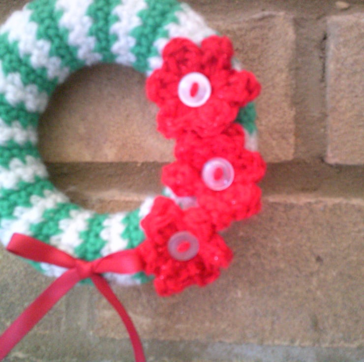 This mini wreath is made using an 11cm polystyrene wreath ring and the covered with a crocheted green and white striped cover and embellished with red flowers on one side and a red bow at the bottom. It had a small loop on the reverse so you can hang it up easily.