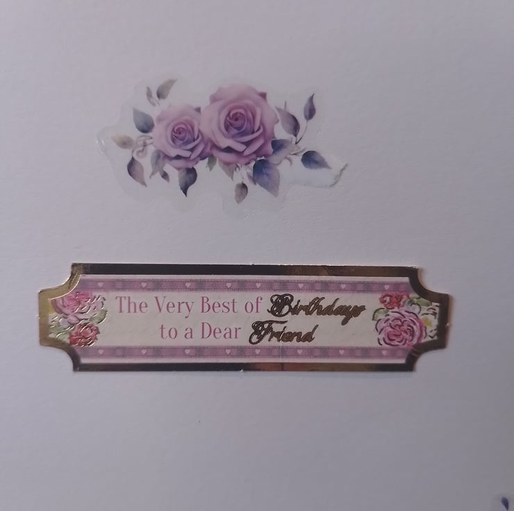 A 9" x 6" birthday card with roses in each corner and a happy birthday sentiment in the middle which says to a dear friend. with a spray of roses above, all cards come with envelopes and cellophane wrapped to keep them clean