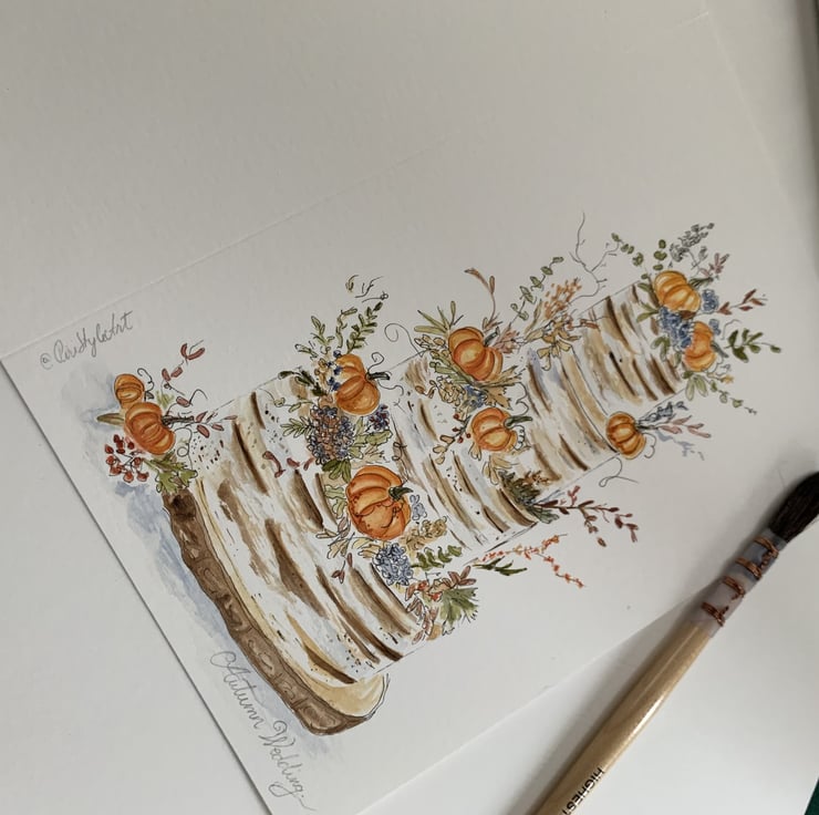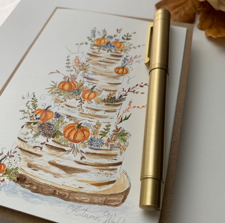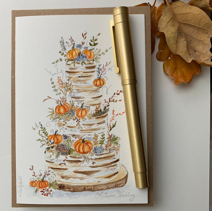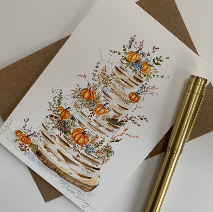 This original hand-painted watercolour card features an autumn wedding cake adorned with pumpkins, berries, blue florals, and rustic foliage. Inspired by cosy seasonal weddings, the design blends the warmth of autumn and the elegance of an event — perfect for couples, anniversaries, or autumn-themed celebrations.