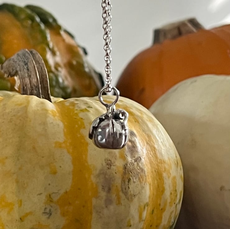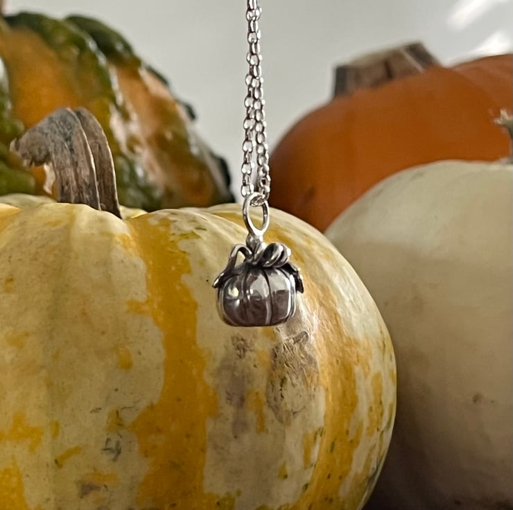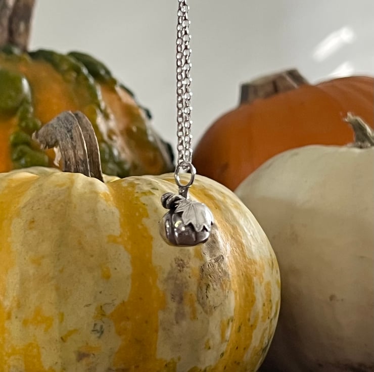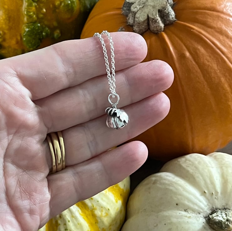 Solid silver pumpkin, carved from recycled silver with a cute little leaf and curly wine.