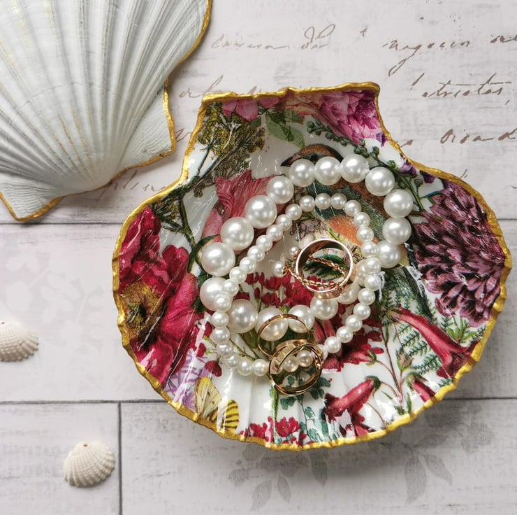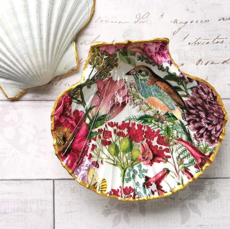 A 12cm wide scallop shell trinket dish decoupaged in a vintage floral design with bird and edged with gold. These shell dishes are glazed with resin for durability. There is a matching hanging shell ornament in my store.
