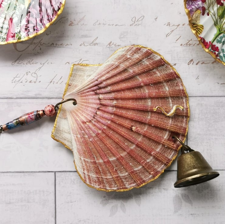 These shell decorations are handmade using the decoupage technique on to natural scallop shells. The shells are then sealed and glazed with resin, giving them a glossy porcelain like finish and the edges gilded with gold.