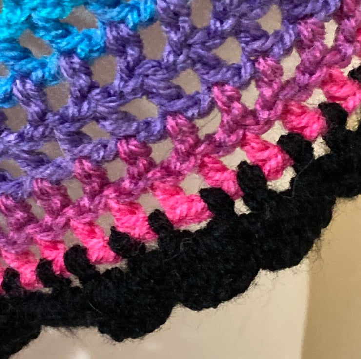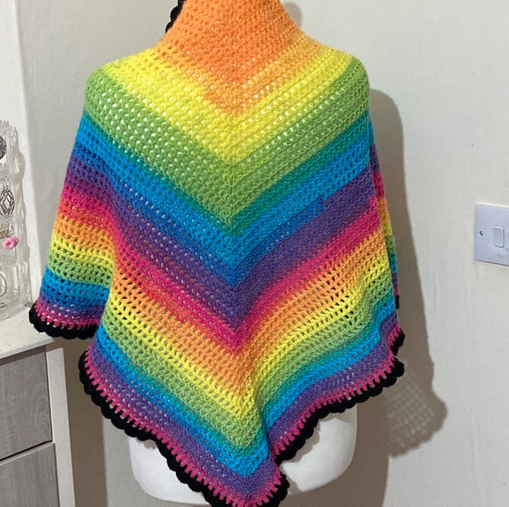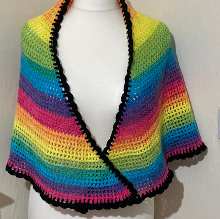 This rainbow shawl is made from premium acrylic yarn in a bright colour way out lined in black to make the colours pop even more. It is a lightweight shawl which can be worn in a multiple of ways to enhance any outfit. It is the perfect accessory to brighten up the winter months as a scarf, or as a shawl to keep the chill of your shoulders in the summer months.